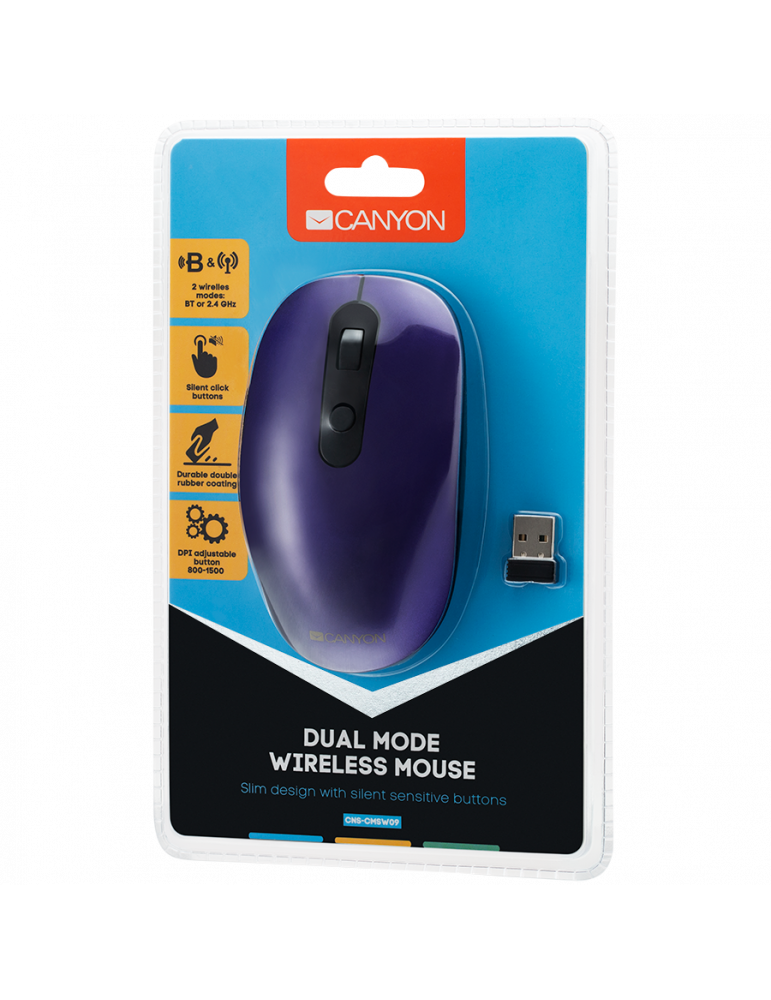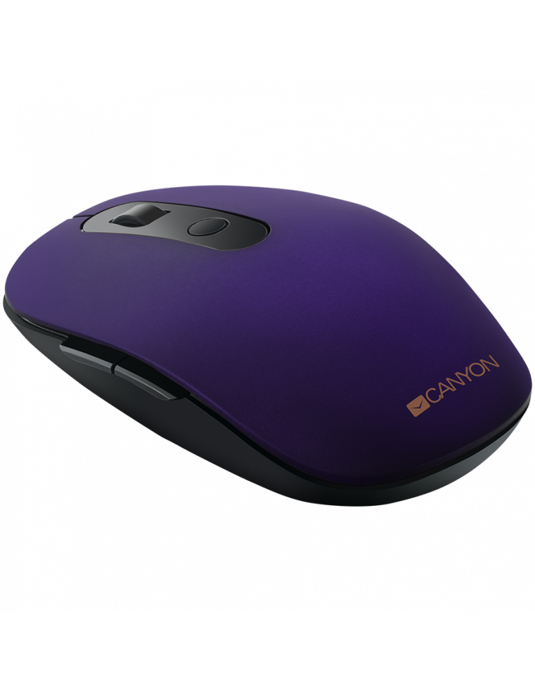 Безжична мишка Canyon 2 in 1 Wireless optical mouse with 6 buttons, DPI 800/1000/1200/1500, 2 mode(BT/ 2.4GHz), Battery AA*1pcs, Violet, silent switch for right/left keys, 65.4*112.25*32.3mm, 0.092kg