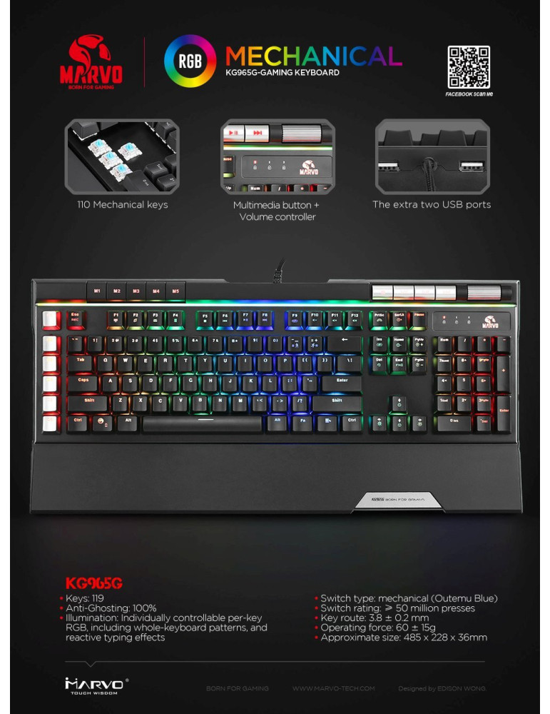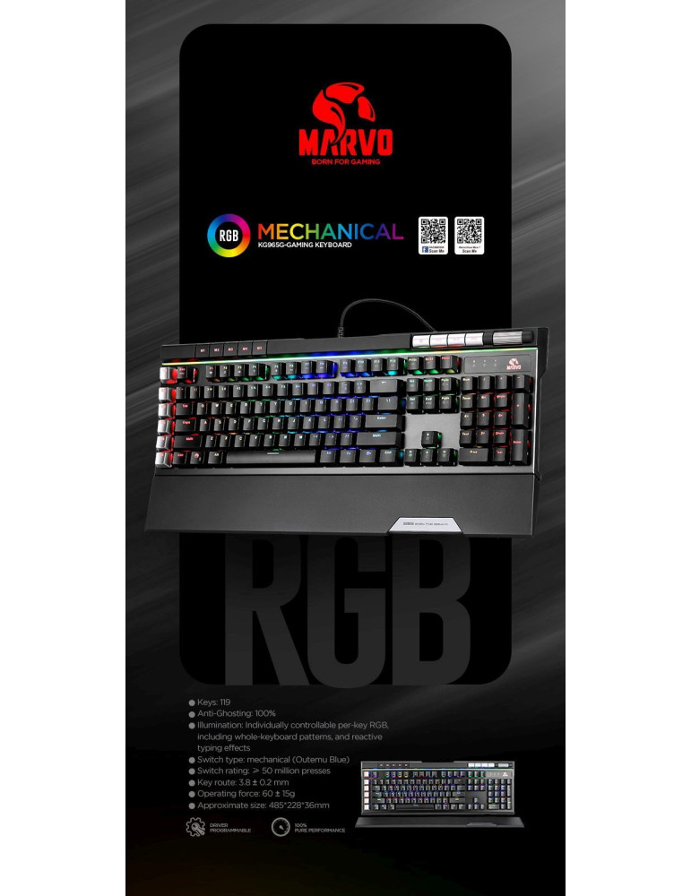 Механична геймърска клавиатура Marvo PRO KG965G - RGB, Macros, Blue Outemu switches, 119 keys - MARVO-PRO-KG965G