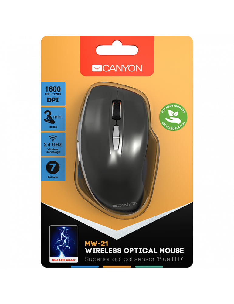 Безжична мишка Canyon ,with 7 buttons, DPI 800/1200/1600, Battery:AAA*2pcs ,Dark gray72*117*41mm 0.075kg