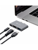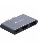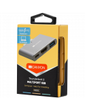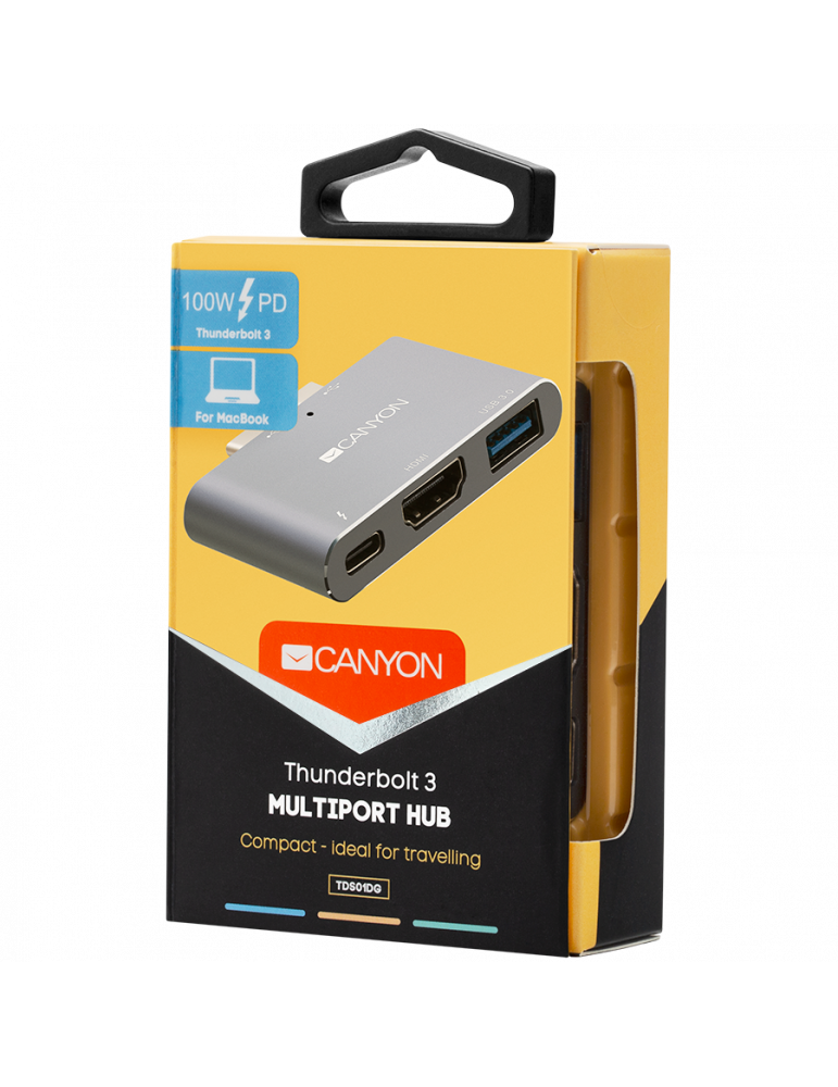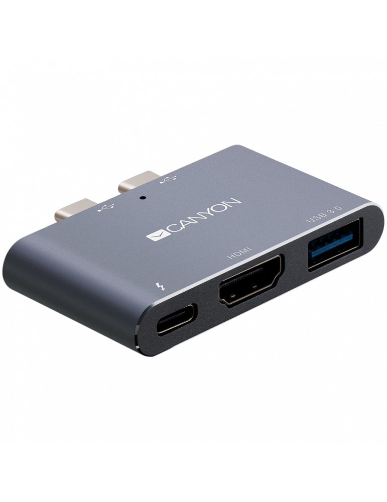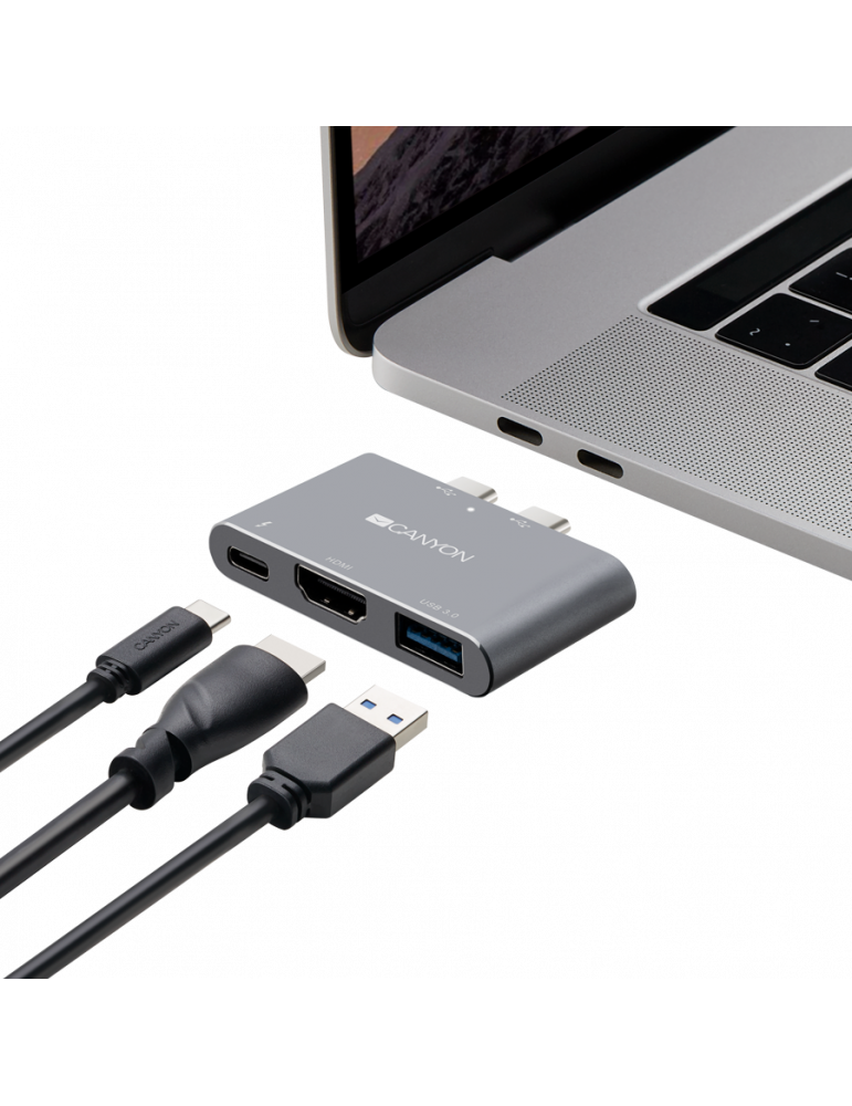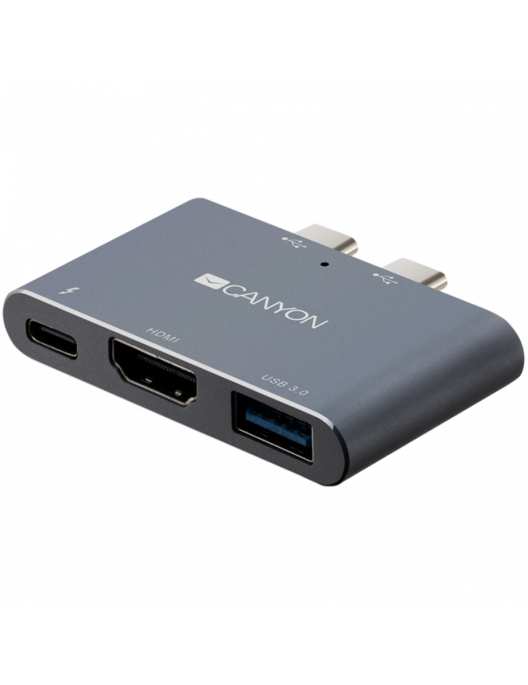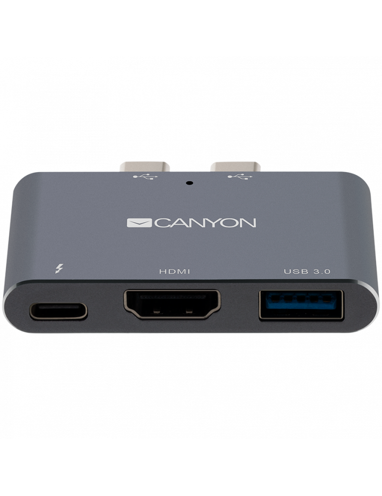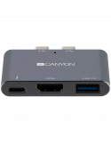 Докинг станция Canyon с 3 порта, with Thunderbolt 3 Dual type C male port, 1*Thunderbolt 3 female+1*HDMI+1*USB3.0. Input 100-240V, Output USB-C PD100W&USB-A 5V/1A, Aluminium alloy, Space gray, 59*35.5*10mm, 0.028kg