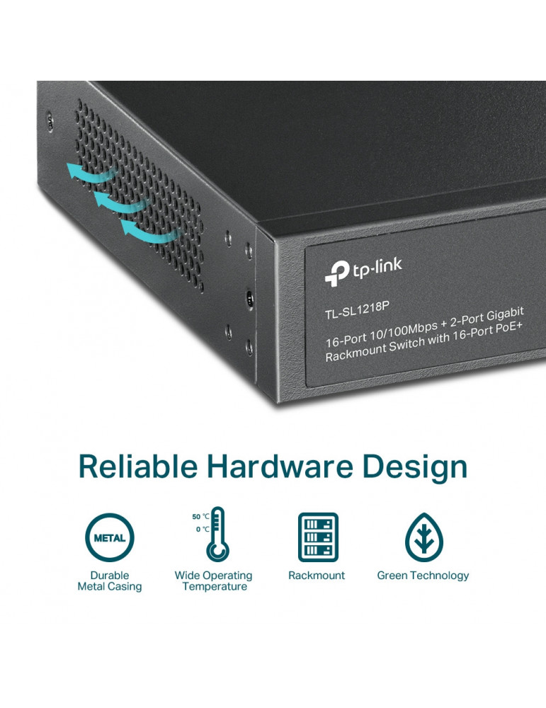 Комутатор с 16-PoE порта TP-Link TL-SL1218P, 16-портов 10/100 Mbps 2-порта gigabit PoE