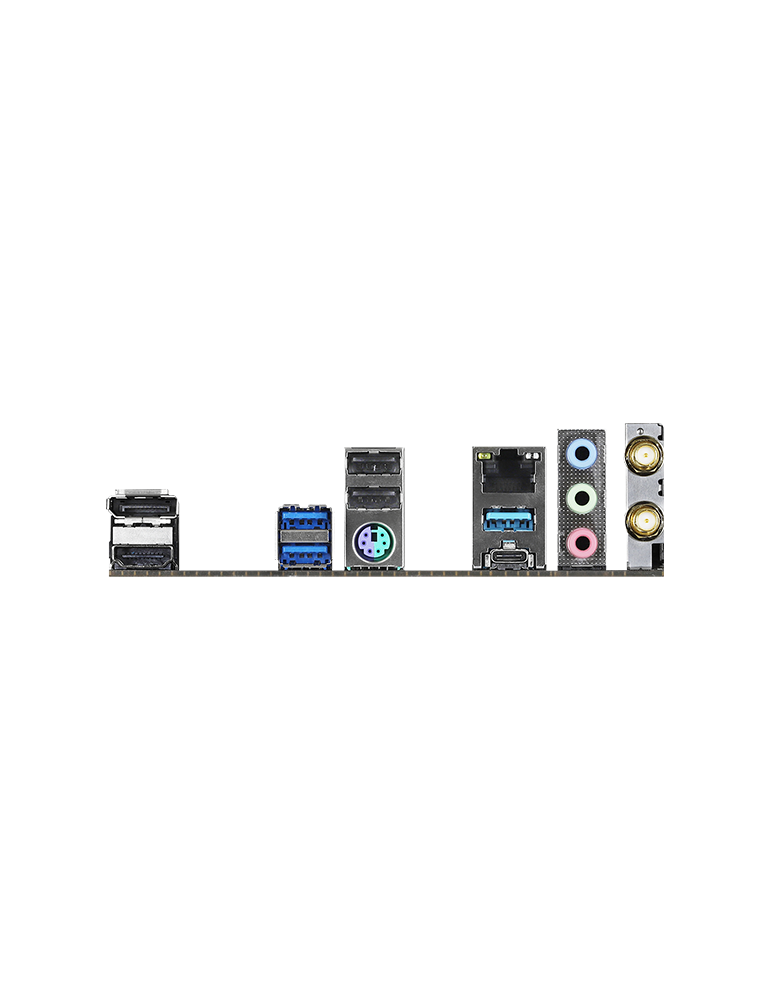 | I/O | - 2 x Antenna Ports; - 1 x PS/2 Mouse/Keyboard Port; - 1 x HDMI Port; - 1 x DisplayPort 1.4; - 2 x USB 2.0 Ports (Supports ESD Protection); - 3 x USB 3.2 Gen1 Type-A Ports (Supports ESD Protection); - 1 x USB 3.2 Gen1 Type-C Port (Supports ESD Protection); - 1 x RJ-45 LAN Port with LED (ACT/LINK LED and Скорост LED); - HD Audio Jacks: Line in / Front Speaker / Microphone |