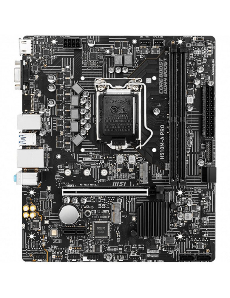 Дънна платка MSI H510M-A PRO,mATX,Socket 1200,Intel® H510 Chipset,Dual Channel DDR4 3200(MAX) MHz,1x PCIe x16 slot,1x HDMI 2.0b,1x VGA port,1x M.2 slot,2xUSB 3.2 Gen 1,2xUSB 2.0,Audio - 7.1,1Gbps LAN - H510M-A_PRO