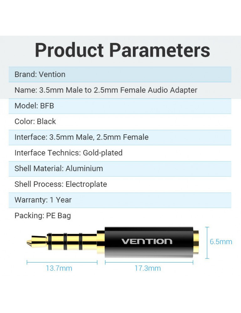 Адаптер Vention Audio 3.5mm M / 2.5mm F Black Metal - BFBB0