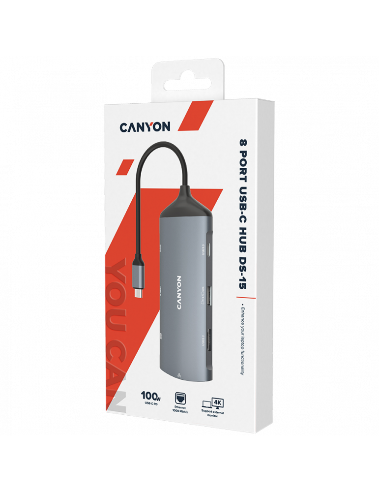 Докинг станция Canyon 8 in 1 hub, HDMI , Gigabit LAN, USB C 2бр, USB3.1 2бр , USB2.0, SD, кабел 15cm, тъмно сив - CNS-TDS15