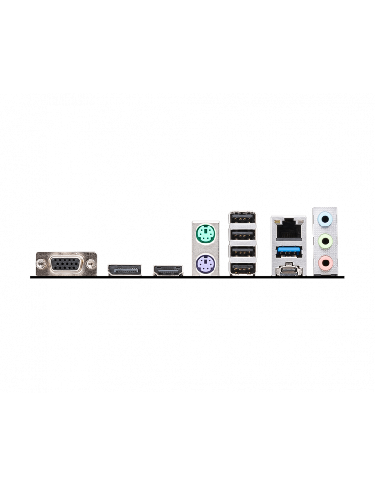 | VGA; DisplayPort; HDMI™; Keyboard / Mouse; USB 2.0; LAN port; Audio Connectors; USB 3.2 Gen 1 5Gbps (Type-A); USB 3.2 Gen 2 10Gbps (Type-C) |