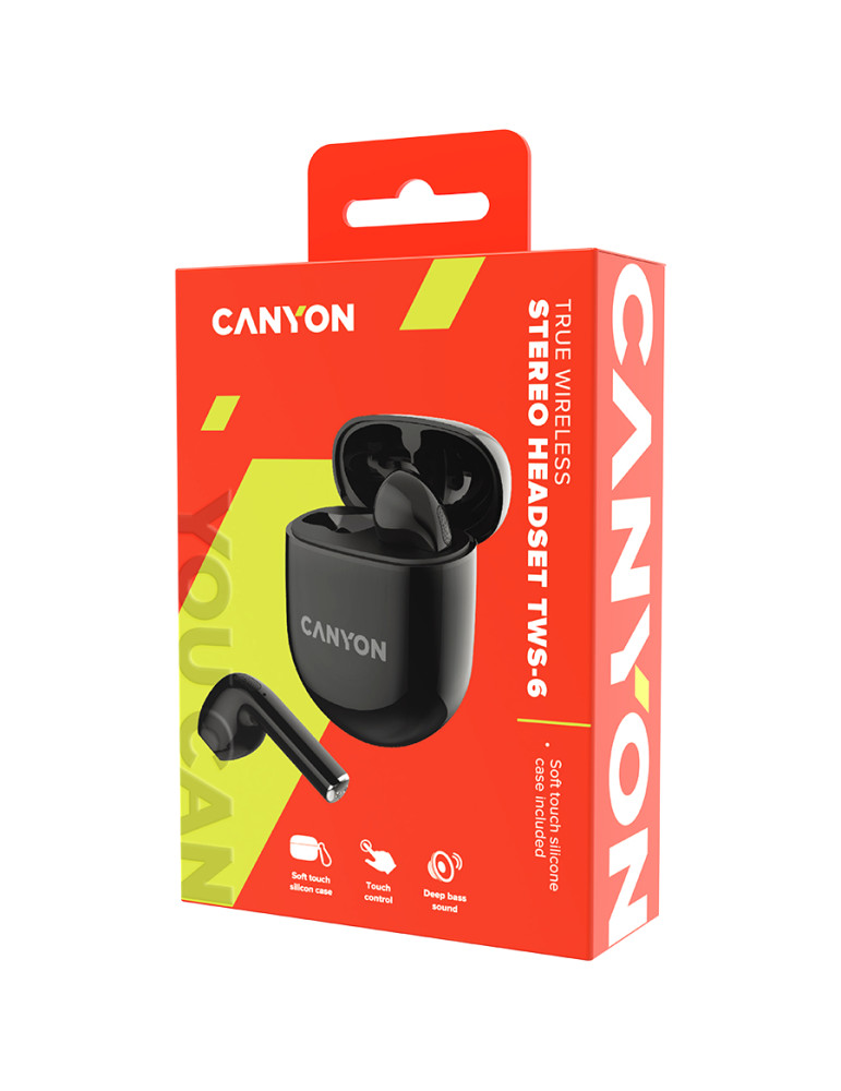Слушалки Canyon TWS-6 Bluetooth headset, with microphone, BT V5.3 JL 6976D4, Frequence Response:20Hz-20kHz, battery EarBud 30mAh*2+Charging Case 400mAh, type-C cable length 0.24m, Size: 64*48*26mm, 0.040kg, Black - CNS-TWS6B