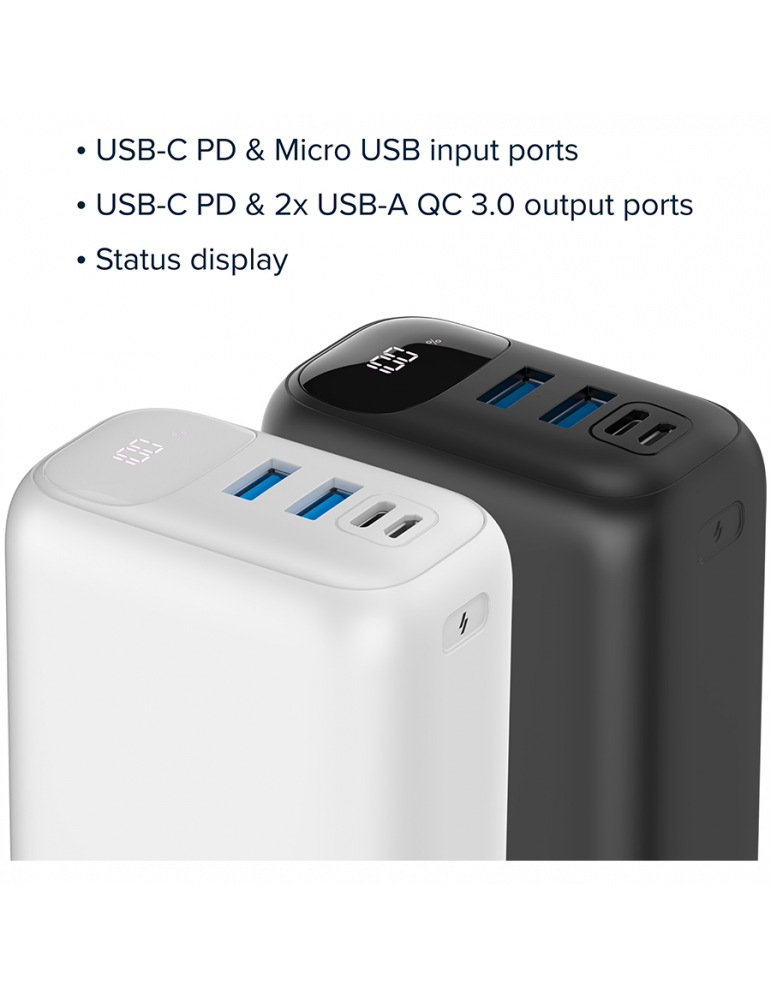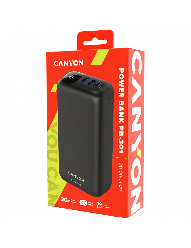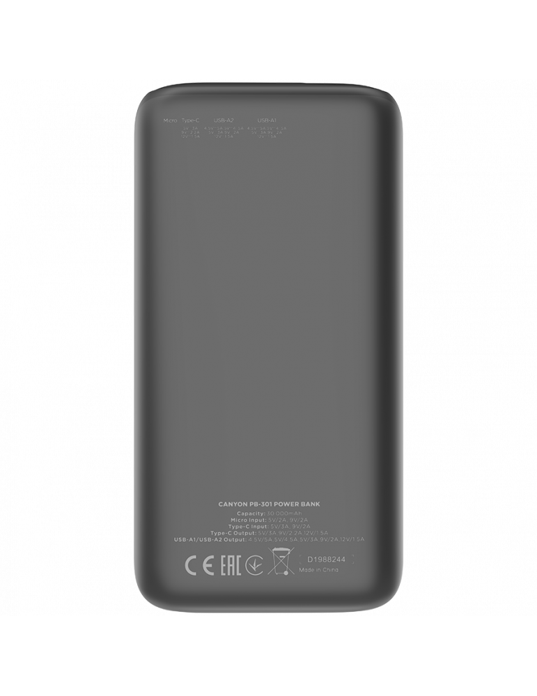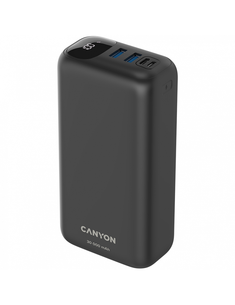 Canyon Power bank 30000mAh Li-poly battery, Input Micro: DC5V/2A, 9V/2A Input Type c PD :DC5V/3A, 9V/2A Output Type C PD:5V/3A,9V/2.2A,12V/1.5AOutput USB A1+USBA 2: 5V3A,5V/4.5A,4.5V/5A,9V2A,12V1.5A,22.5W quick charging cable 0.3m - CNE-CPB301B