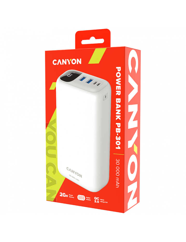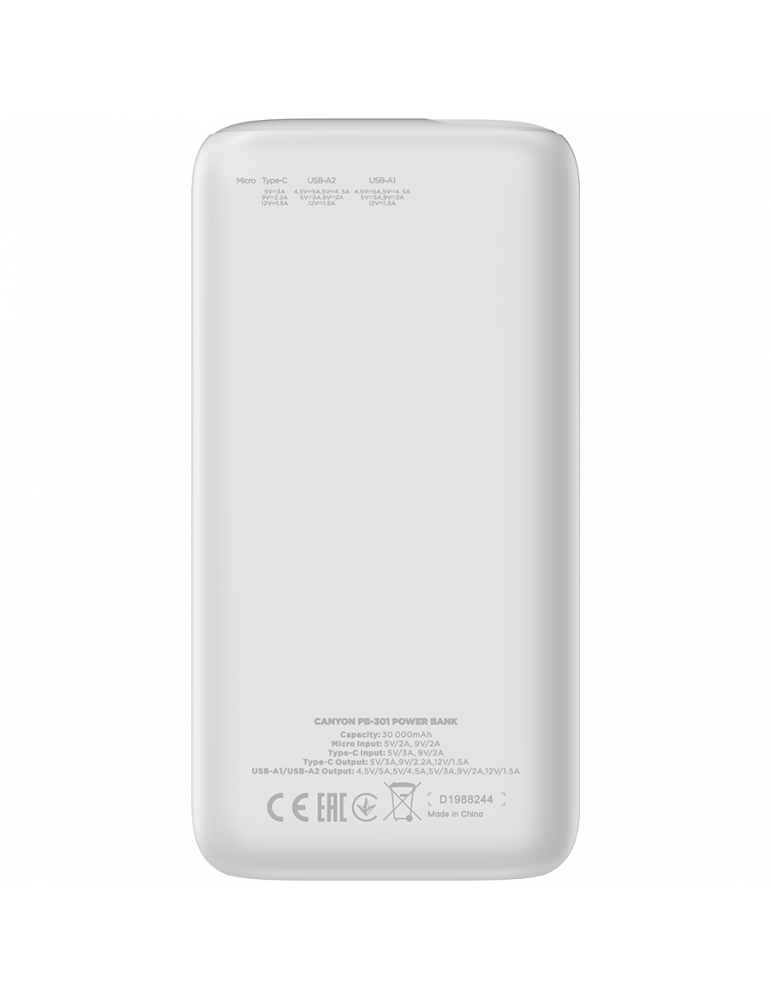Canyon PB - 301 Power bank 30000mAh Li-poly battery, Input Micro: DC5V/2A, 9V/2A Input Type c PD : DC5V/3A, 9V/2A, Output Type C PD:5V/3A,9V/2.2A,12V/1.5AOutput USB A1+USBA 2 : 5V3A,5V/4.5A,4.5V/5A,9V2A,12V1.5A,22.5W quick charging cable 0.3m, 1 - CNE-CPB301W