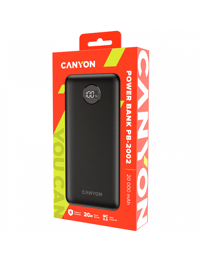Canyon PB-2002 Power bank 20000mAh Li-poly battery, Input Type-C 5V3A,9V2A,18W , Output Type-C:5V3A,9V2.2A,12V1.5A,20W, Output USBA1/USBA2:5V3A,5V/4.5A,4.5V/5A,9V2A,12V1.5A,22.5W147.5*69*28.6mm, 0.437g , cable Type C, Black - CNE-CPB2002B