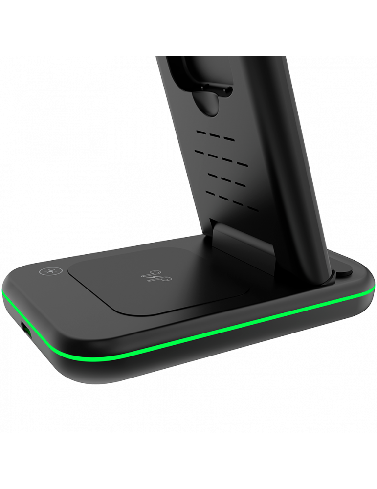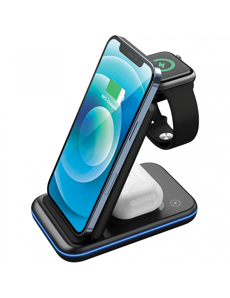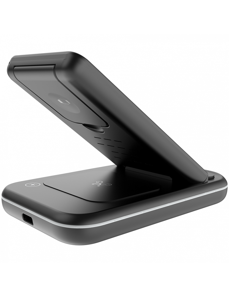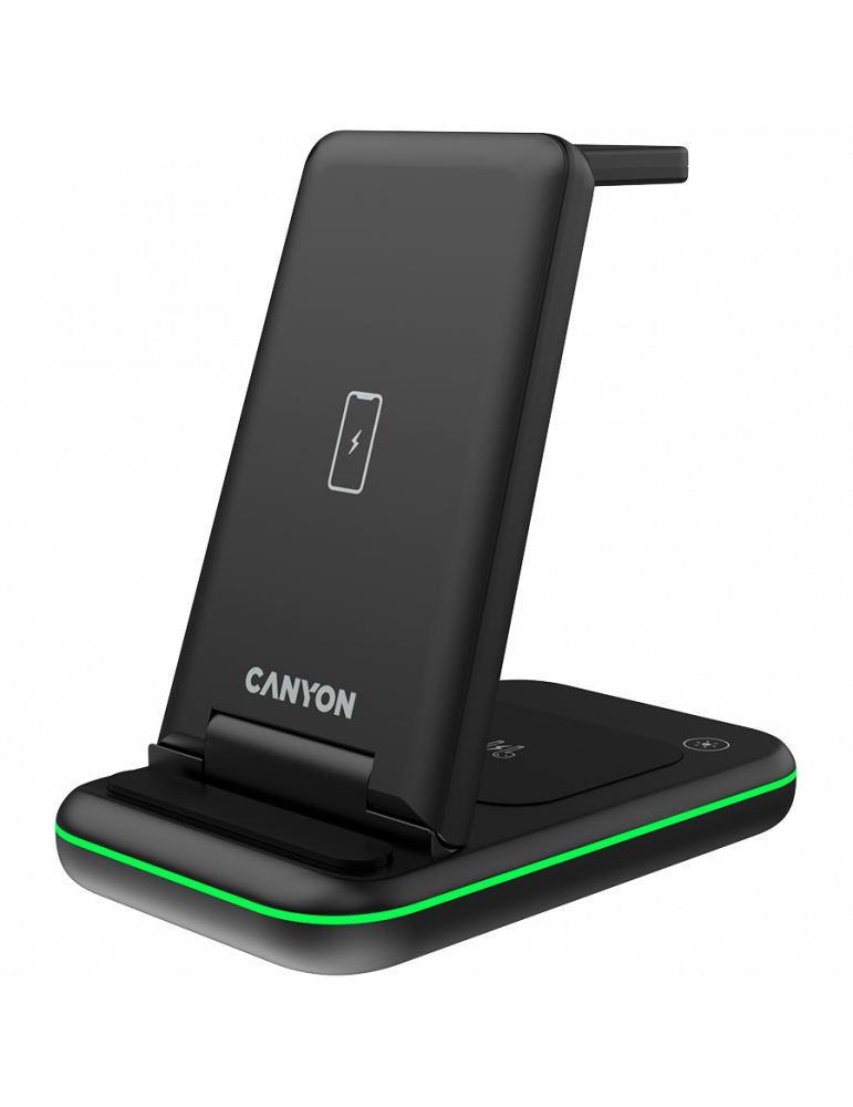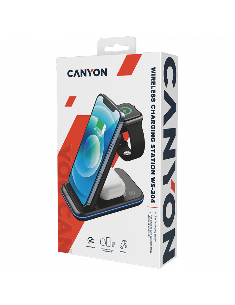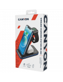 Canyon WS- 304 Foldable 3in1 Wireless charger, with touch button for Running water light, Input 9V/2A, 12V/1.5AOutput 15W/10W/7.5W/5W, Type c to USB-A cable length 1.2m, with QC18W EU plug,132.51*75*28.58mm, 0.168Kg, Black - CNS-WCS304B