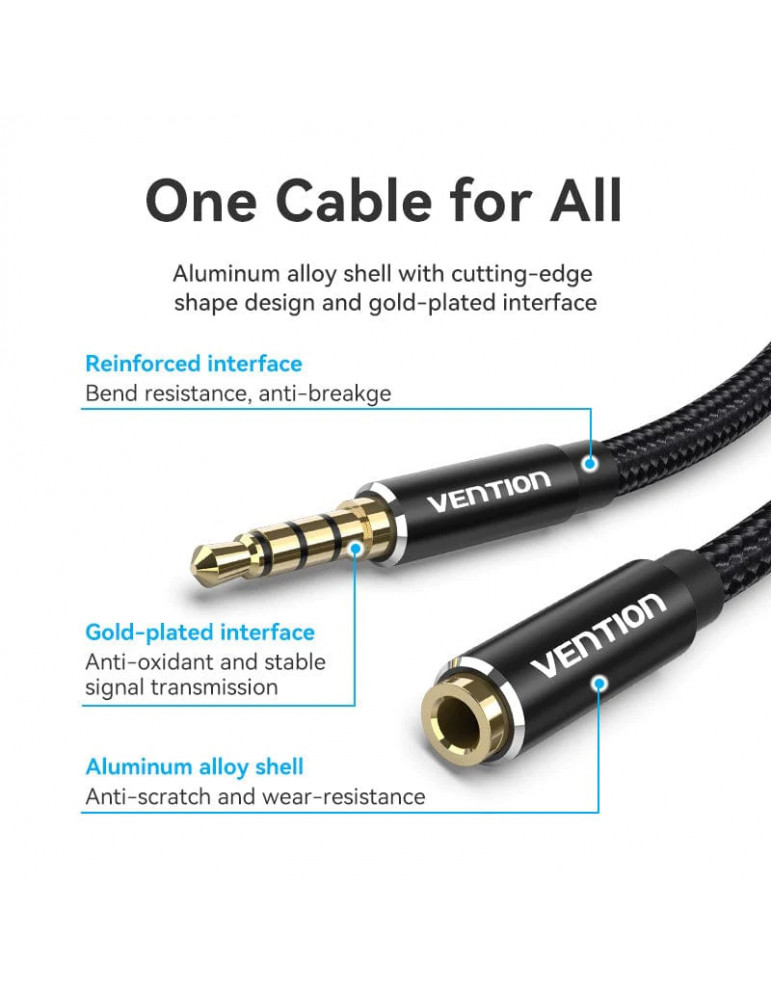 Аудио Кабел Vention Cotton Braided TRRS 3.5mm Male to 3.5mm F, 1.5m Gold plated, Aluminum alloy - BHCBG
