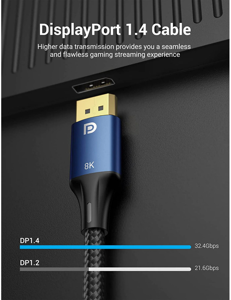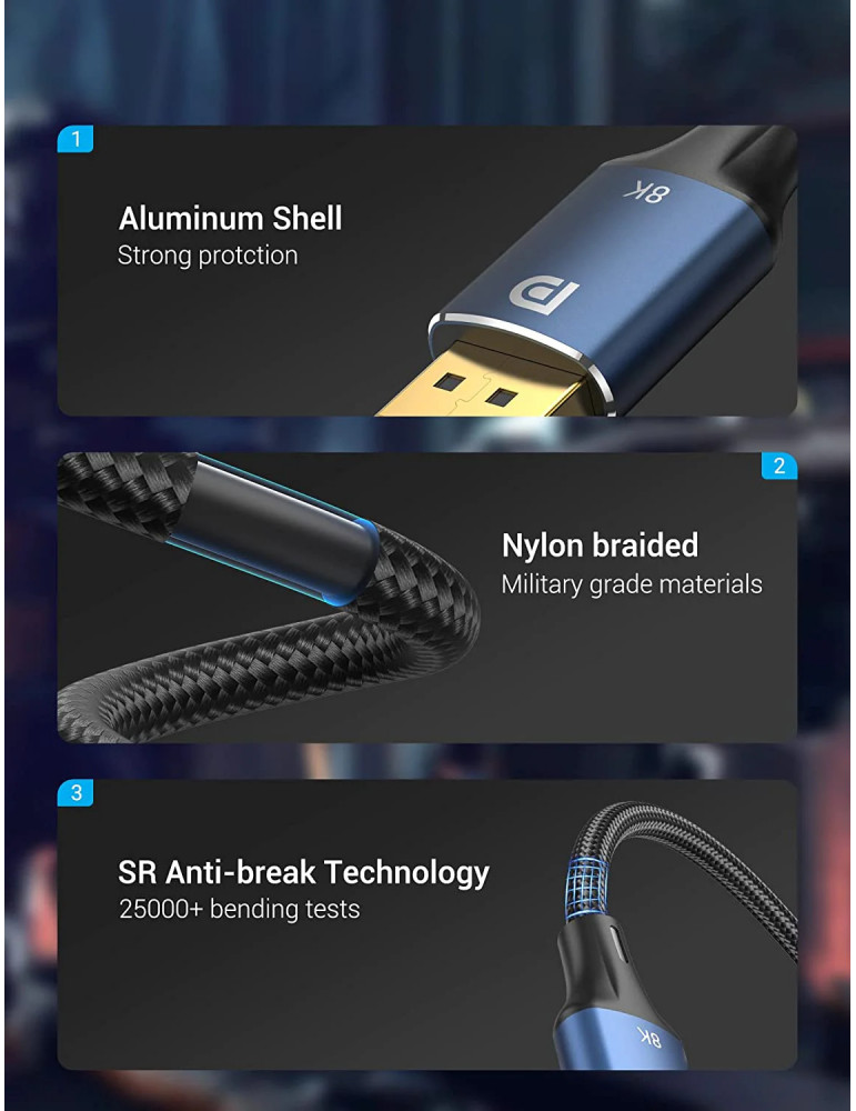 | ДОПЪЛНИТЕЛНИ | Blue Aluminium Shell Cotton Braid Refresh Rate: 8K@60Hz, 4K@144Hz, 2K@165Hz, 1080p@240Hz Support 3D, FreeSync and G-Sync; HBR3,HDCP2.2/CEC/EDID,24K Gold plated Connector |