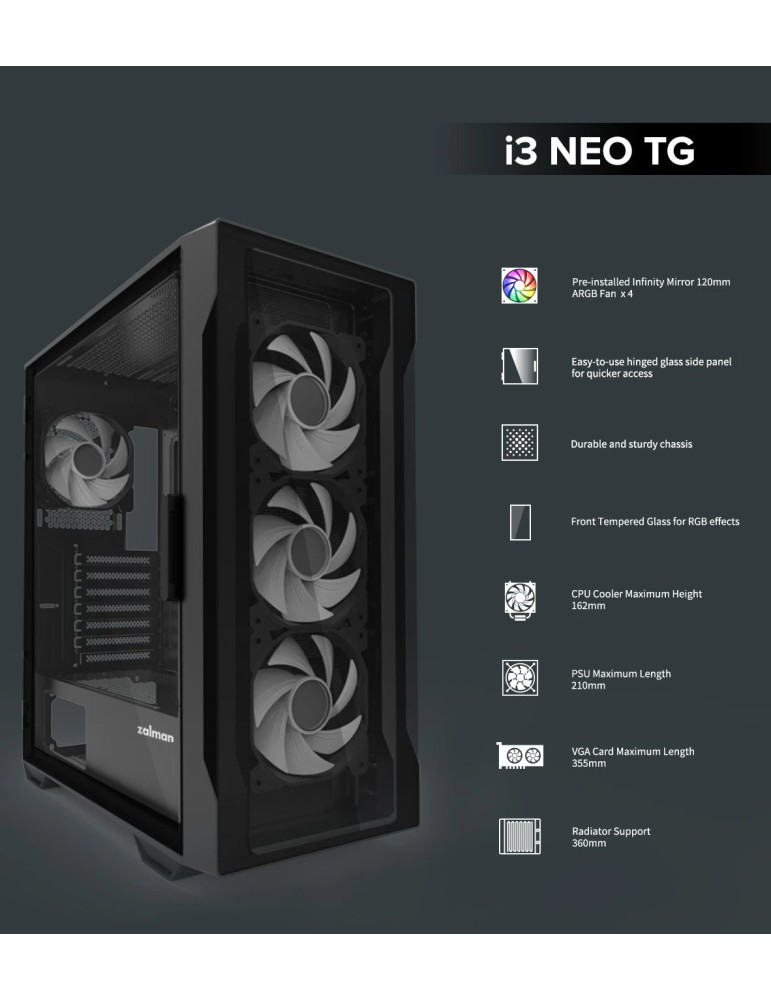 Кутия за компютър Zalman I3 NEO TG Black, ATX, aRGB, Tempered Glass - ZM-I3-NEO-TG-Black