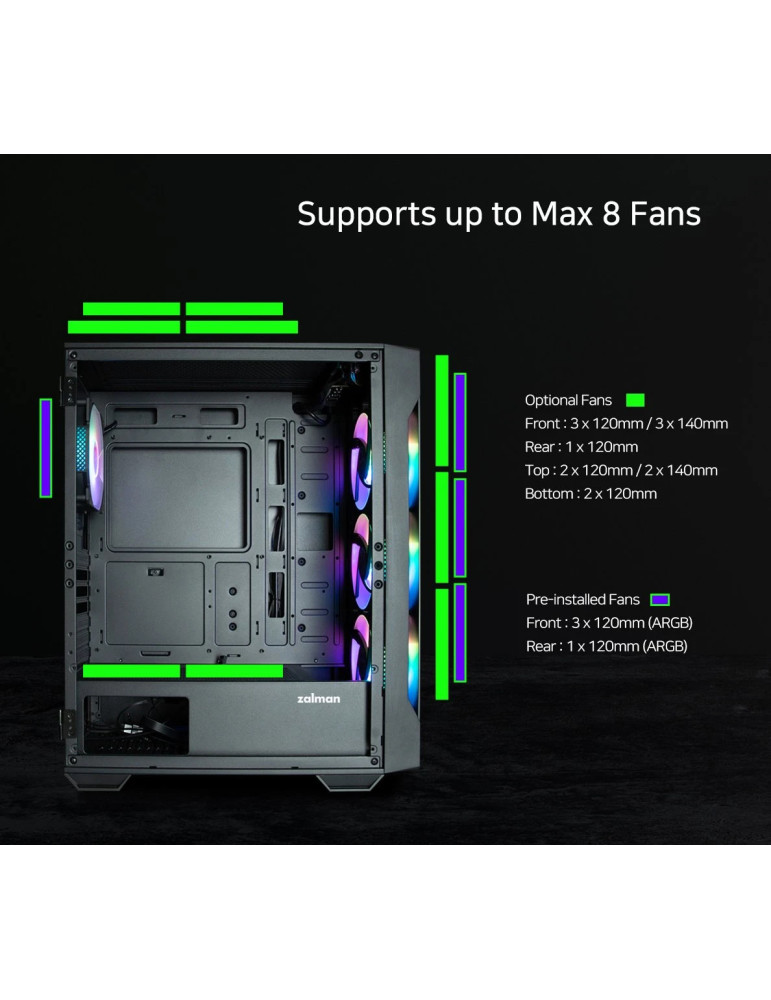 | ВКЛЮЧЕНИ ВЕНТИЛАТОРИ | Front: 3 x 120 mm (with aRGB Effect) Rear: 1 x 120 mm (with aRGB Effect) |