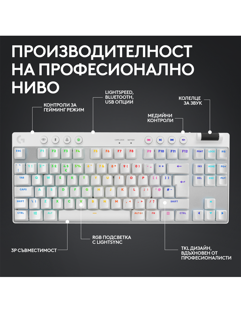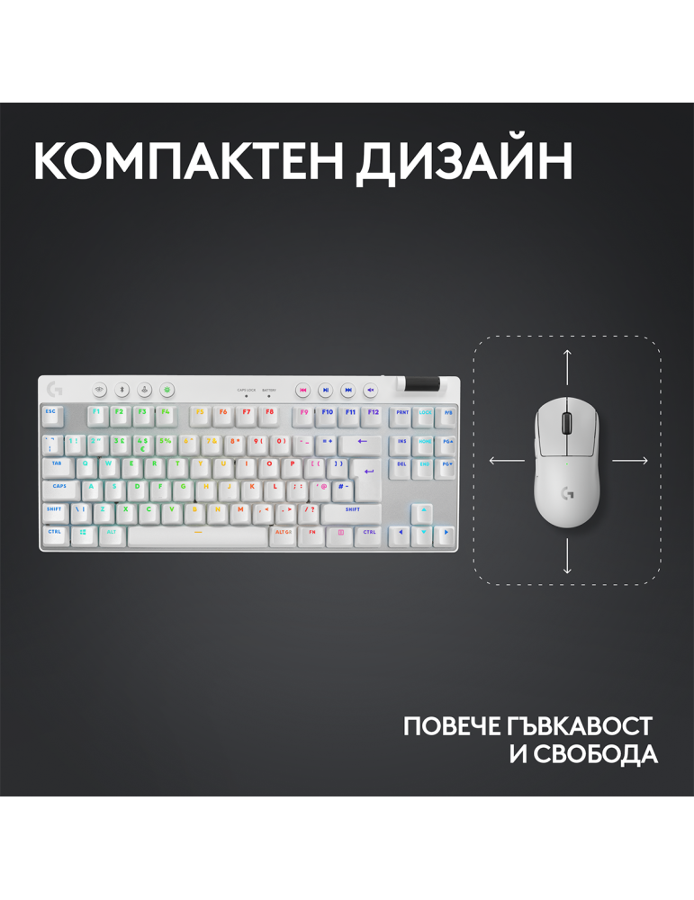 Геймърска механична клавиатура Logitech G Pro X TKL White Lightspeed Tactile Switch - 920-012148