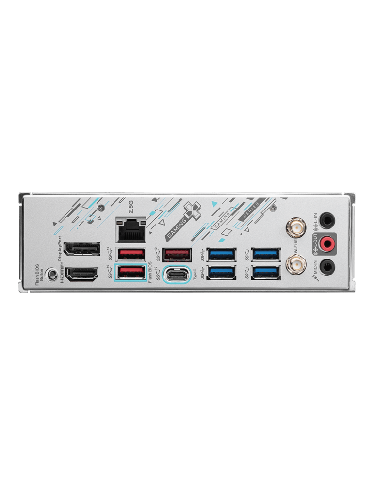 • I/O: DisplayPort; 2.5G LAN; USB 3.2 Gen 2 10Gbps (Type-A); USB 3.2 Gen 1 5Gbps (Type-A); Wi-Fi / Bluetooth; Flash BIOS Button; HDMI™; USB 3.2 Gen 2 10Gbps (Type-A); USB 3.2 Gen 2 10Gbps (Type-C); Audio connectors
