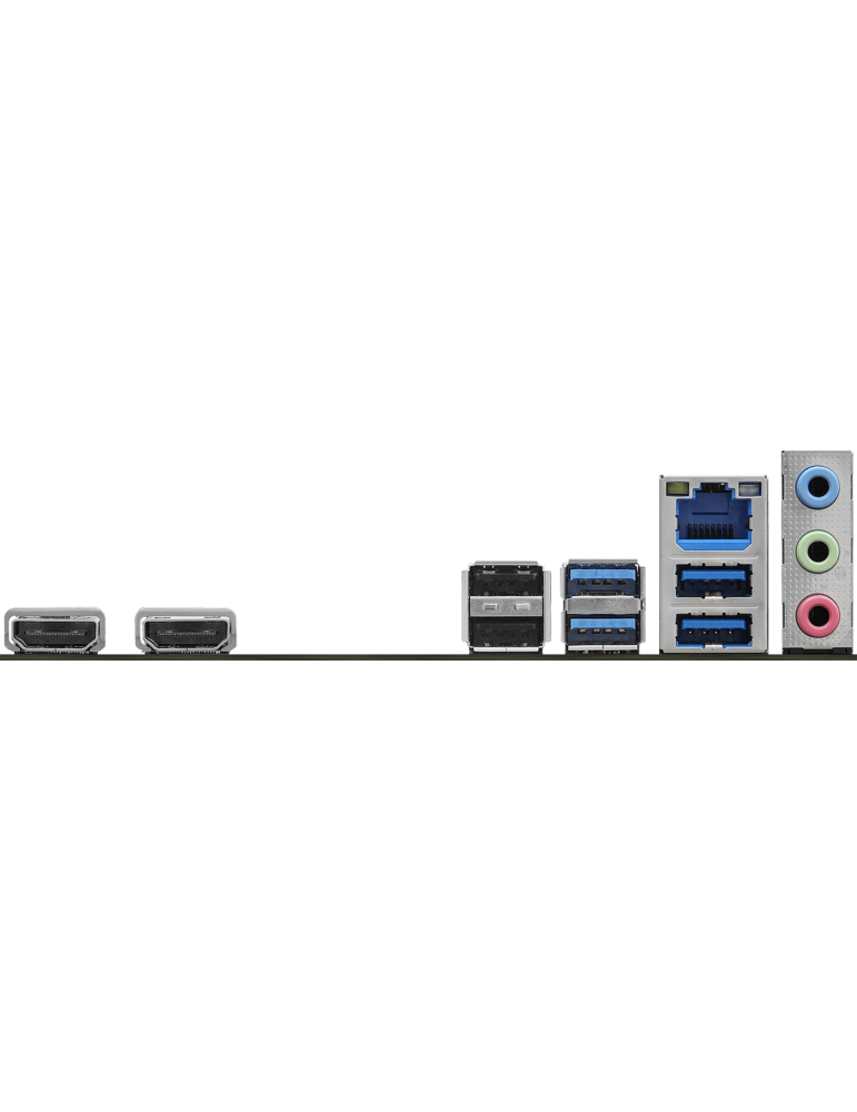 • I/O: - 2 x Antenna Mounting Points; - 2 x HDMI Ports; - 4 x USB 3.2 Gen1 Type-A Ports; - 2 x USB 2.0 Ports; - 1 x RJ-45 LAN Port; - HD Audio Jacks: Line in / Front Speaker / Microphone