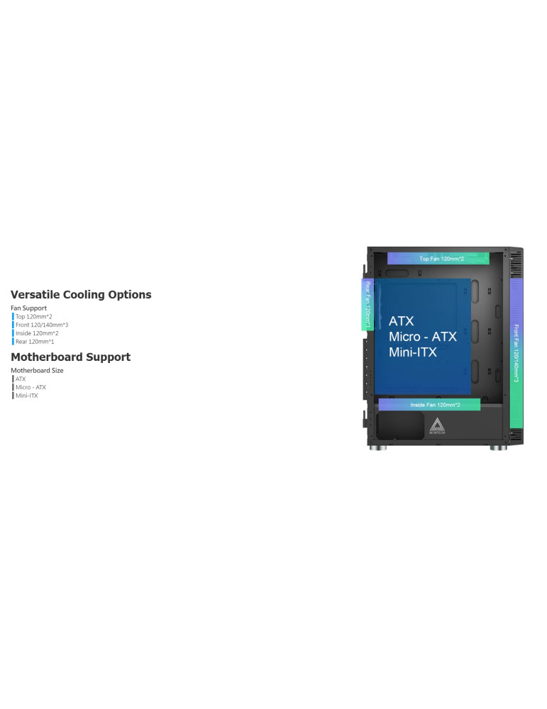 | ОПЦИОНАЛНИ ВЕНТИЛАТОРИ | Front: 3 x 140mm / 3 x 120mm Rear: 1 x 120mm Top: 2 x 120mm |