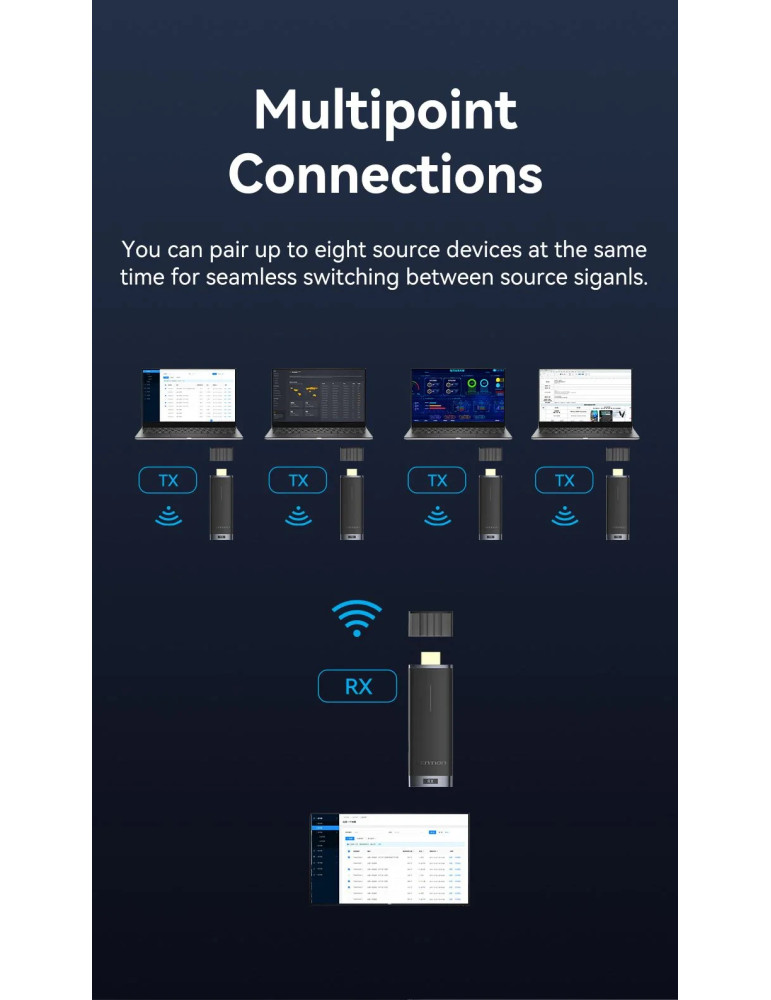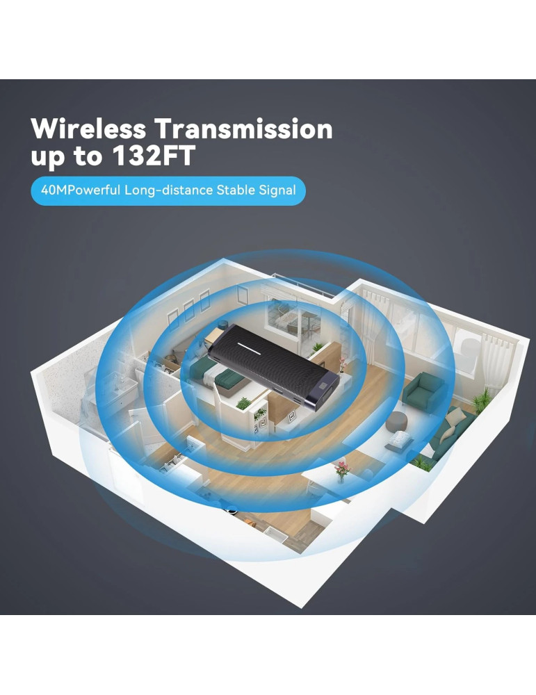 | ДОПЪЛНИТЕЛНИ | Built-in Antenna HDMI Extension Cable Included Mirror/Extend Mode Pair up to eight source devices simultaneously and switch between them seamlessly for ultimate versatility Plug ; Play: No drivers or internet connection required Signals up to 40 meters USB-C Powered: Comes with two 1m USB-C cables for convenient powering |