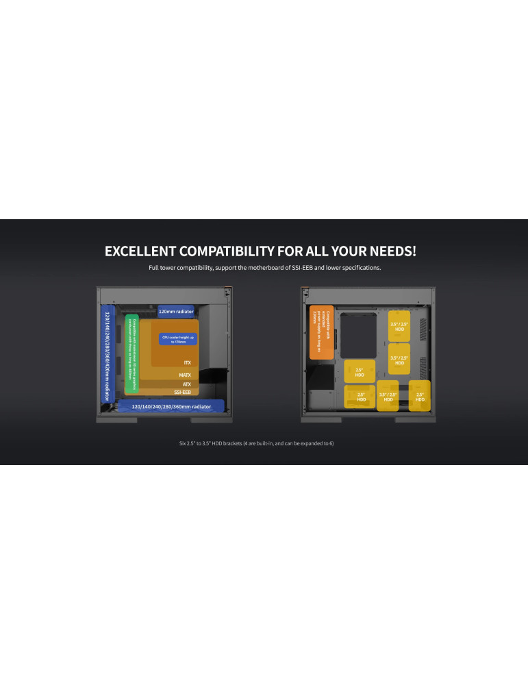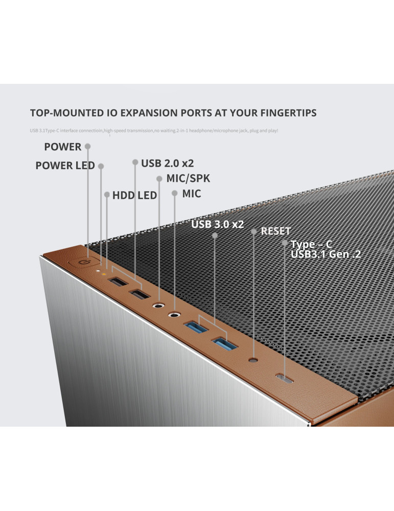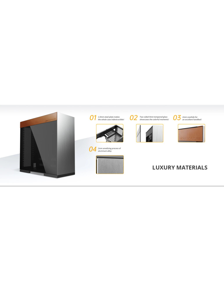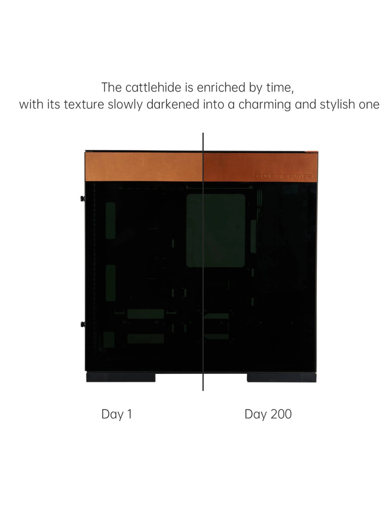 | ДОПЪЛНИТЕЛНИ | A combination of brushed aluminum + genuine cowhide + toughened glass Ample cable routing space with back cable width of 29 mm Equipped with USB3.1 type-c port with transmission speed up to 10Gbps Selected imported SSS-Grade Full-Grain cattlehide The 3.5x PCI-E slot width ensures the air intake of the side-mounted graphics card |