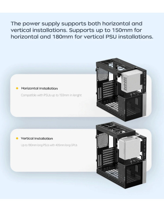 | ДОПЪЛНИТЕЛНИ | 1.0 mm + 1.2 mm steel plate 3.0 mm Tempered Glass, hinged magnetic door MATX volume, but E-ATX Compatibility Mesh footstand Supports graphic cards up to 405 mm in length Up to 4 installation modes, it could be large or small |