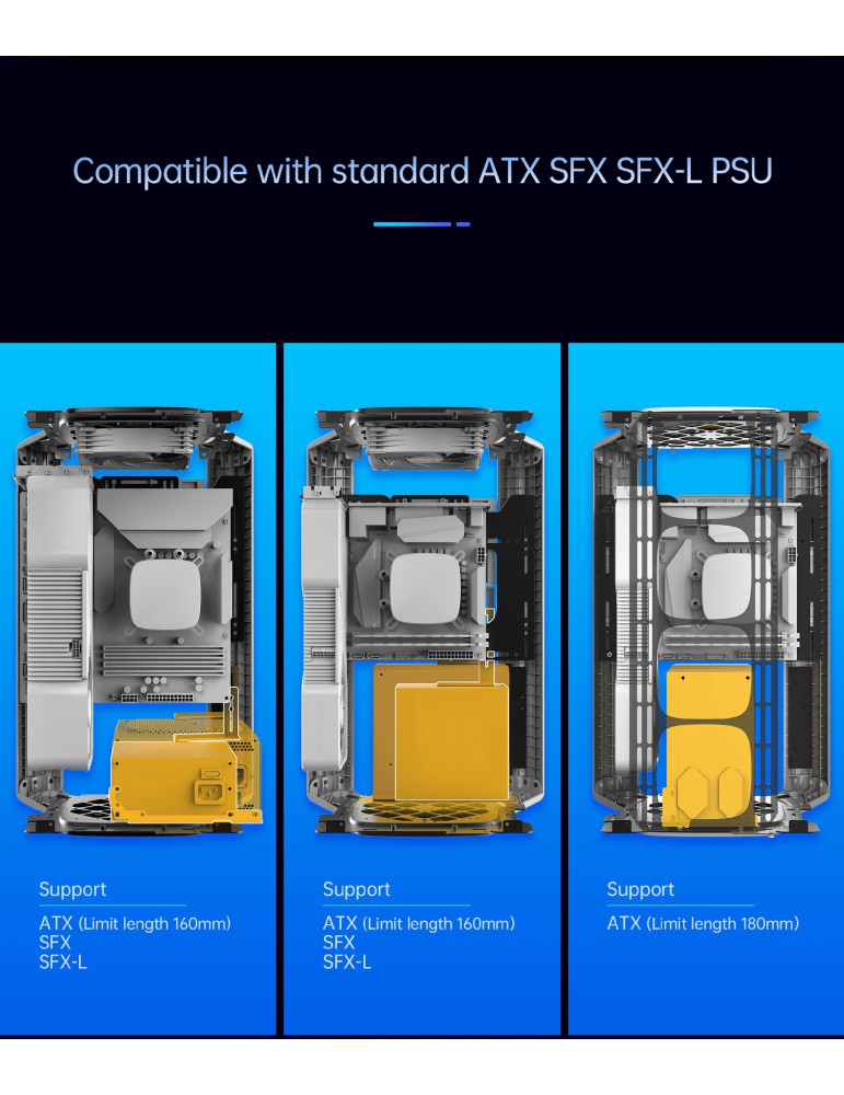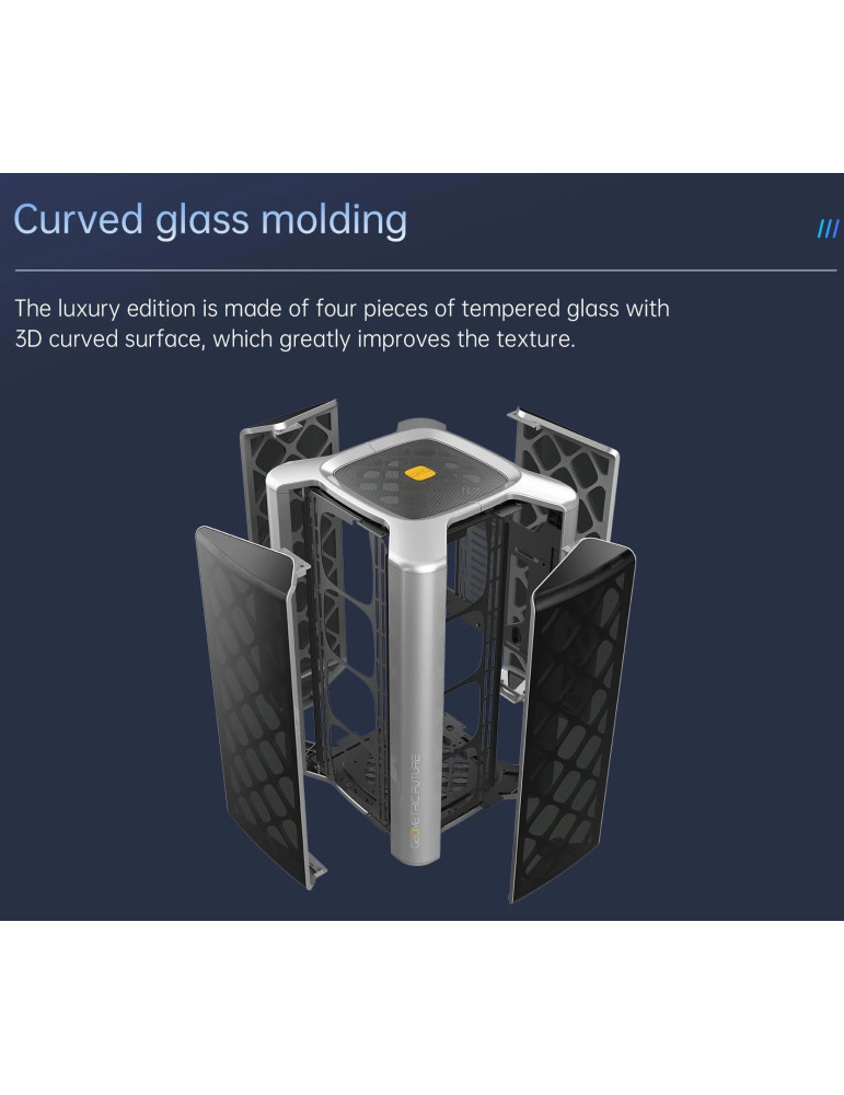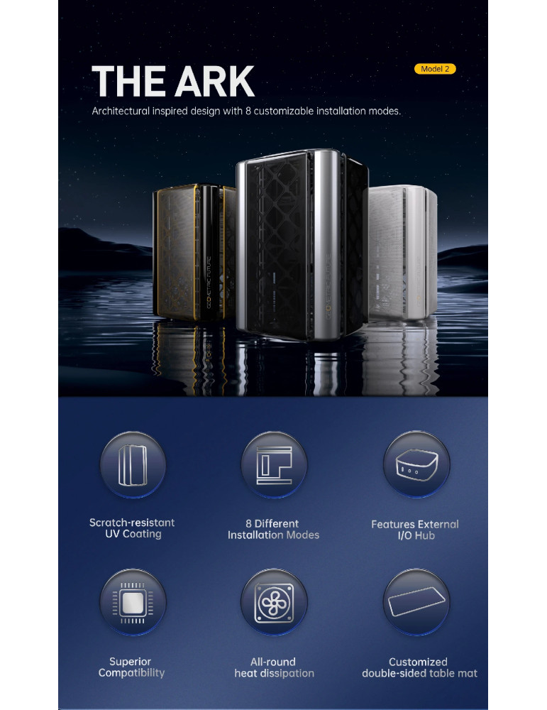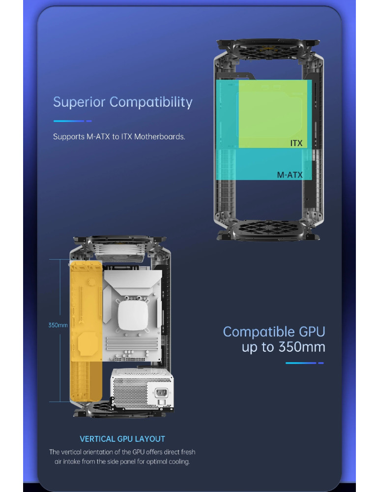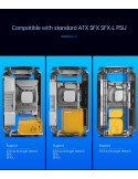 | ДОПЪЛНИТЕЛНИ | Compatible with standard ATX/SFX/SFX-L PSU Double-sided table mat included Equipped with mesh panels on every side External I/O Hub - USB Type-A/USB Type-C/Audio I/O Vertical GPU layout |