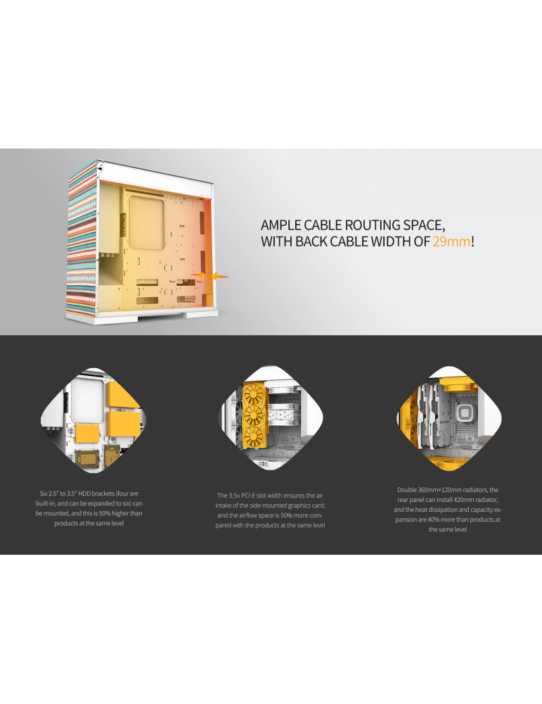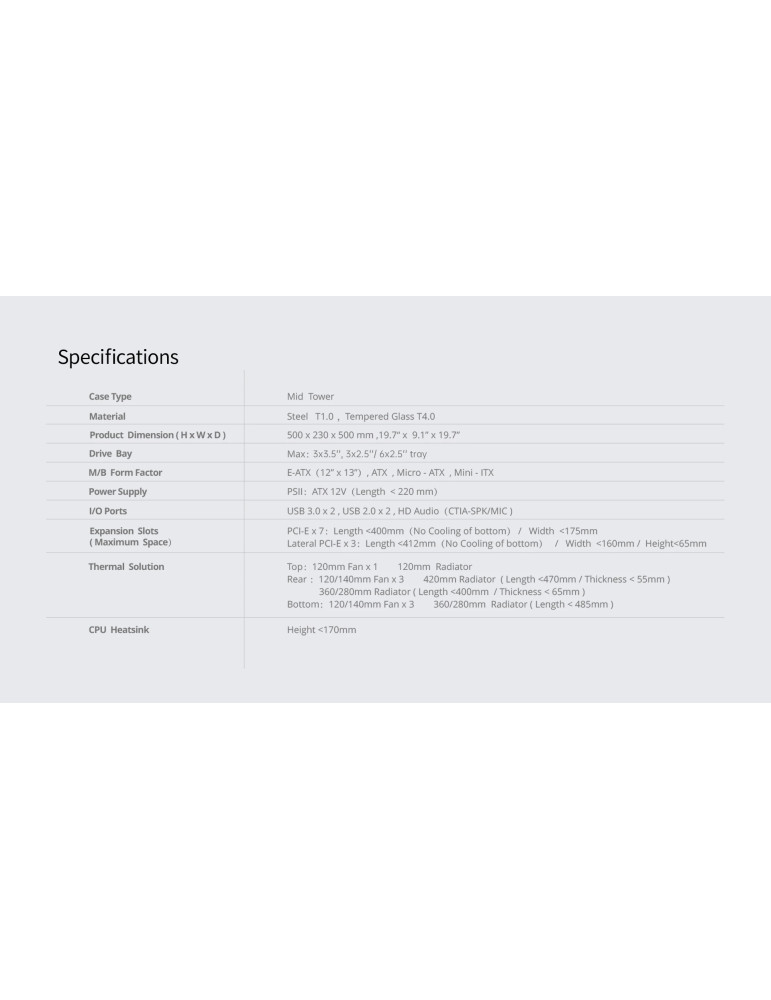 | ДОПЪЛНИТЕЛНИ | Ample cable routing space with back cable width of 29 mm Equipped with USB3.1 type-c port with transmission speed up to 10Gbps The 3.5x PCI-E slot width ensures the air intake of the side-mounted graphics card |