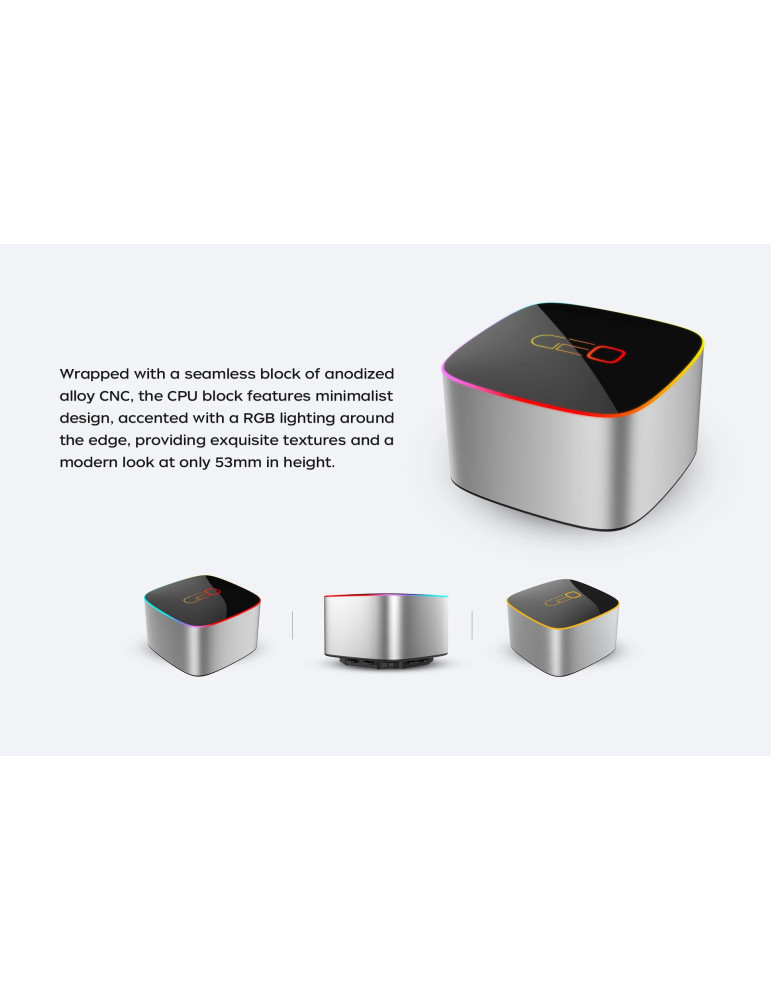 | ДОПЪЛНИТЕЛНИ | Equipped with the high-performance Squama 2503 fans for excellent cooling at low noise levels Eskimo Junior provides a perfect balance of cooling power and aesthetics to your PC Featuring a minimalist CPU block Wrapped with a seamless block of anodized alloy CNC, the CPU block features minimalist design, accented with a RGB lighting, only 53 mm in height |