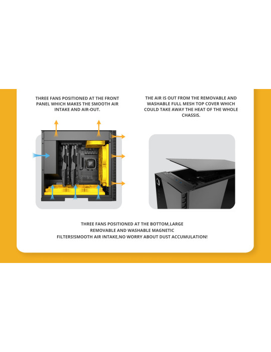 | ДОПЪЛНИТЕЛНИ | Dual 360+240 water cooler ensures high performance Fully compatible with 30 series graphics cards or graphics cards as long as 350mm, vertical installation is supported without deformation Independent power supply compartment as long as 180 mm Large removable and washable magnetic filters at the bottom Three-sided tempered glass U-Shaped stable footstand |