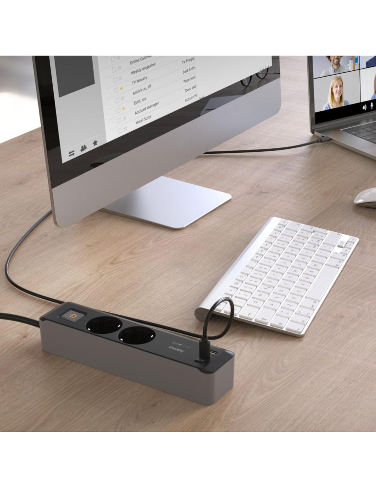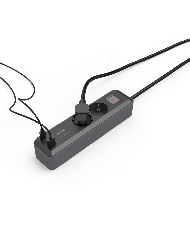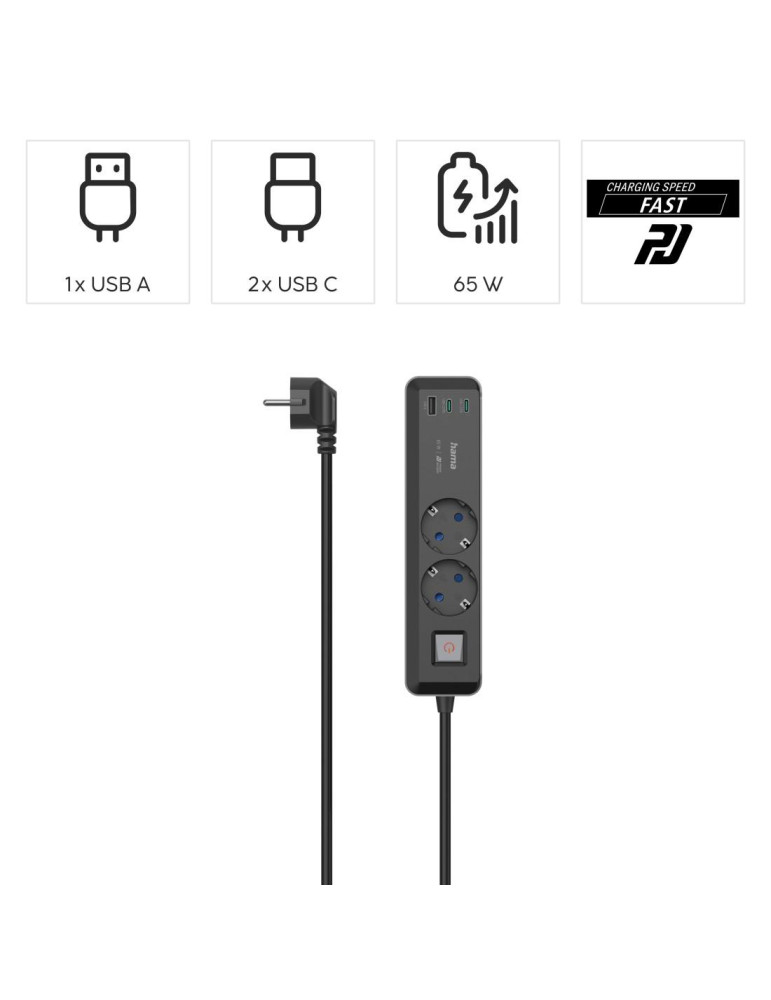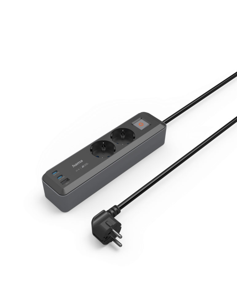 Разклонител Hama, 2-гнезда, USB-C/A 65 W, PD, ключ on/off, 1.4 m, черен/сив - 223188