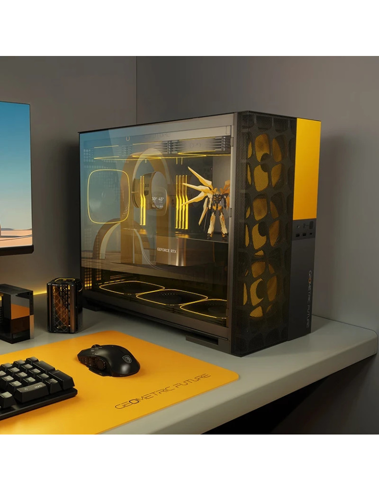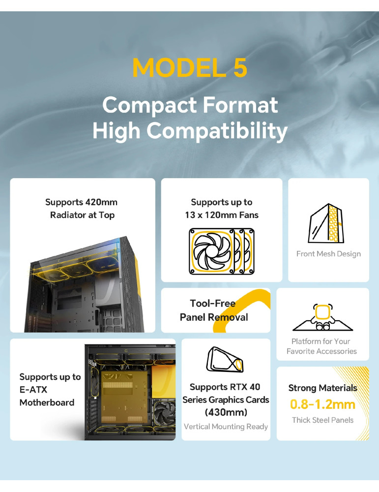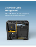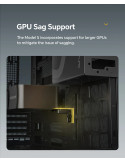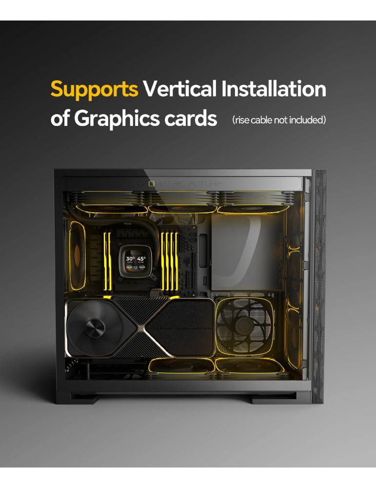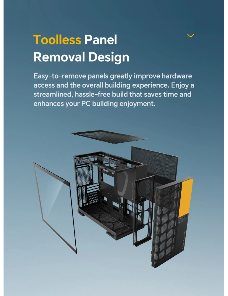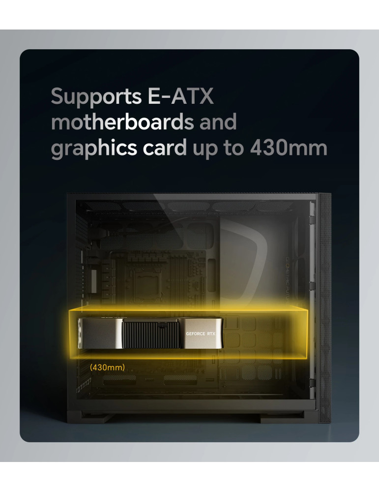 | ДОПЪЛНИТЕЛНИ | 0.8-1.2mm thick steel for entire chassis Fun yet functional built-in display platform Optimized mesh panel for maximum airflow performance Supports 420mm radiator, E-ATX and 430mm GPUs Supports up to 13 x 120mm fans Unique location for the PSU |