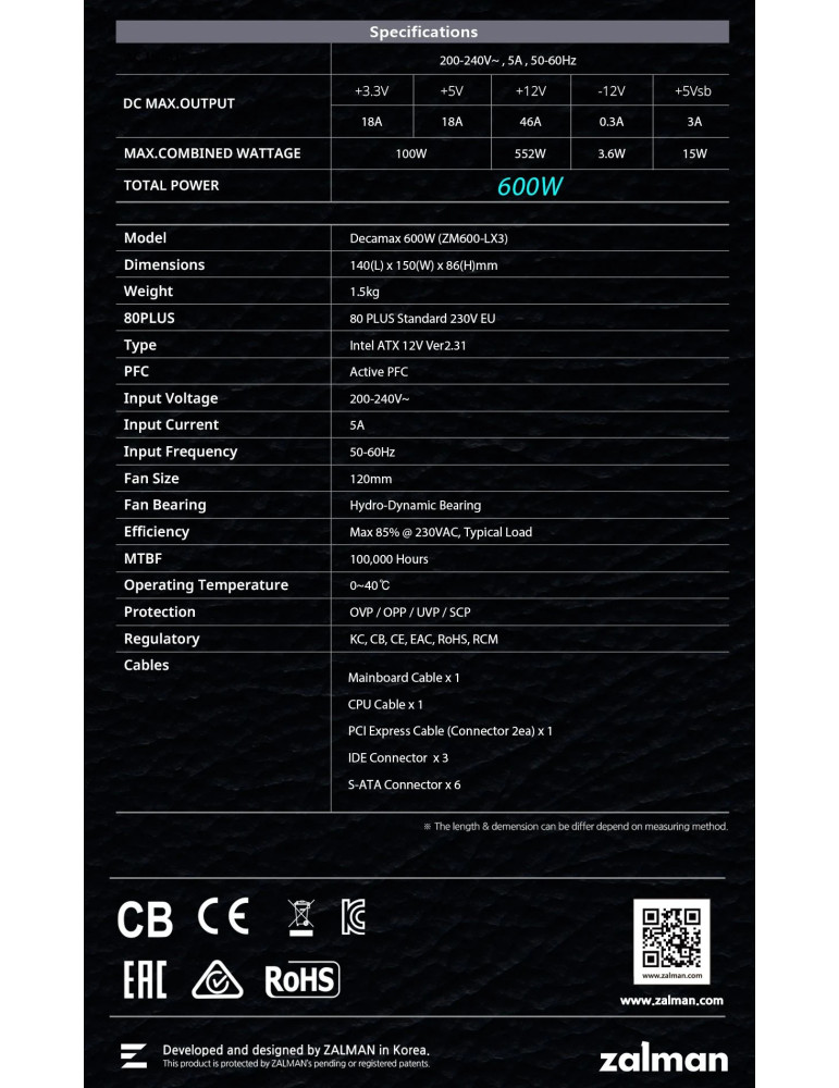 Захранване Zalman PSU DecaMax 600W 80 - ZM600-LX3