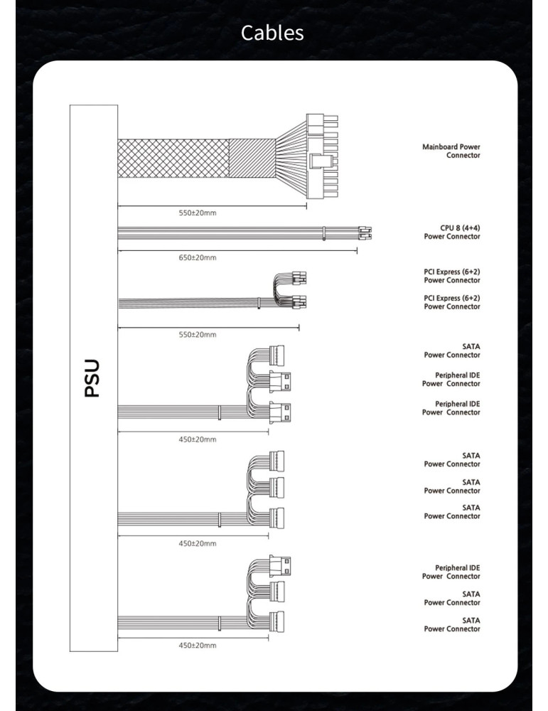| ДРУГИ | 12V Single Rail 91% Availability Active PFC with Up to 99% All Black and simple Cables High performance Capacitor (105°C) INTEL 5Vsb 3.0A Compatible OPP, OVP, UVP, SCP |