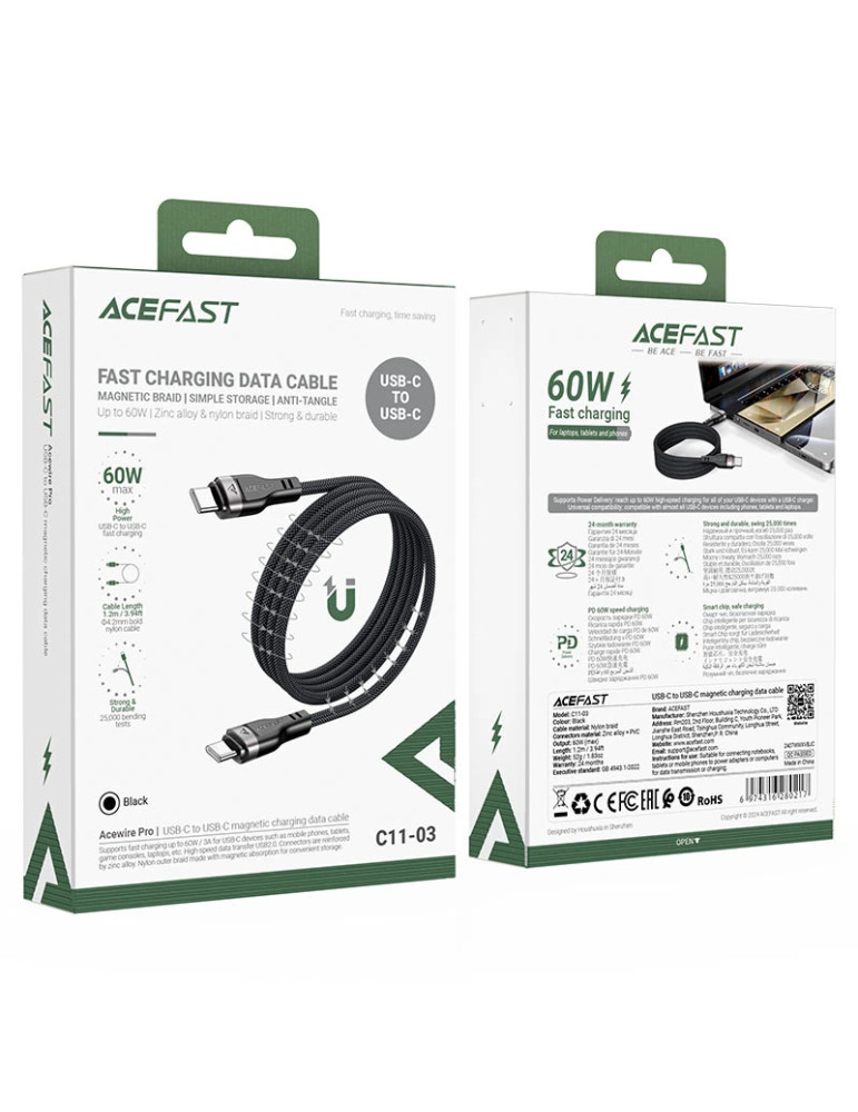 Кабел Acefast USB-C to USB-C Cable 60W MAGNETIC 1.2m - C11-03 - Black - ACEFAST-C11-03-BK