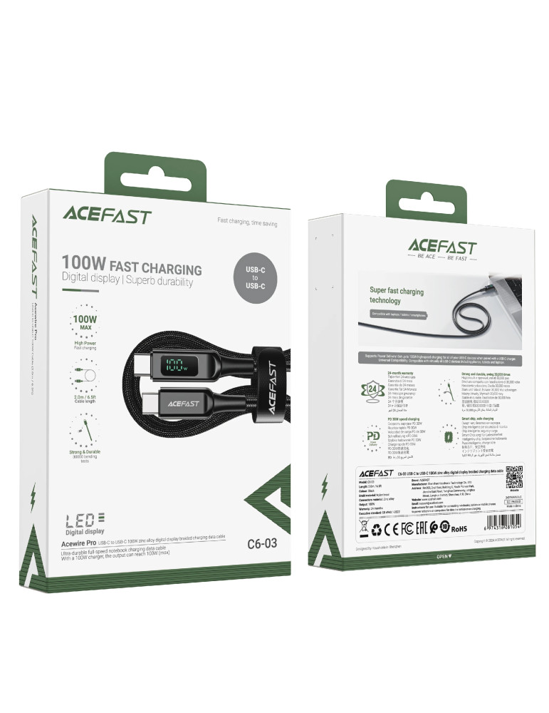 Кабел Acefast USB-C to USB-C Cable 100W 2m with digital display - C6-03 - Black - ACEFAST-C6-03-BK