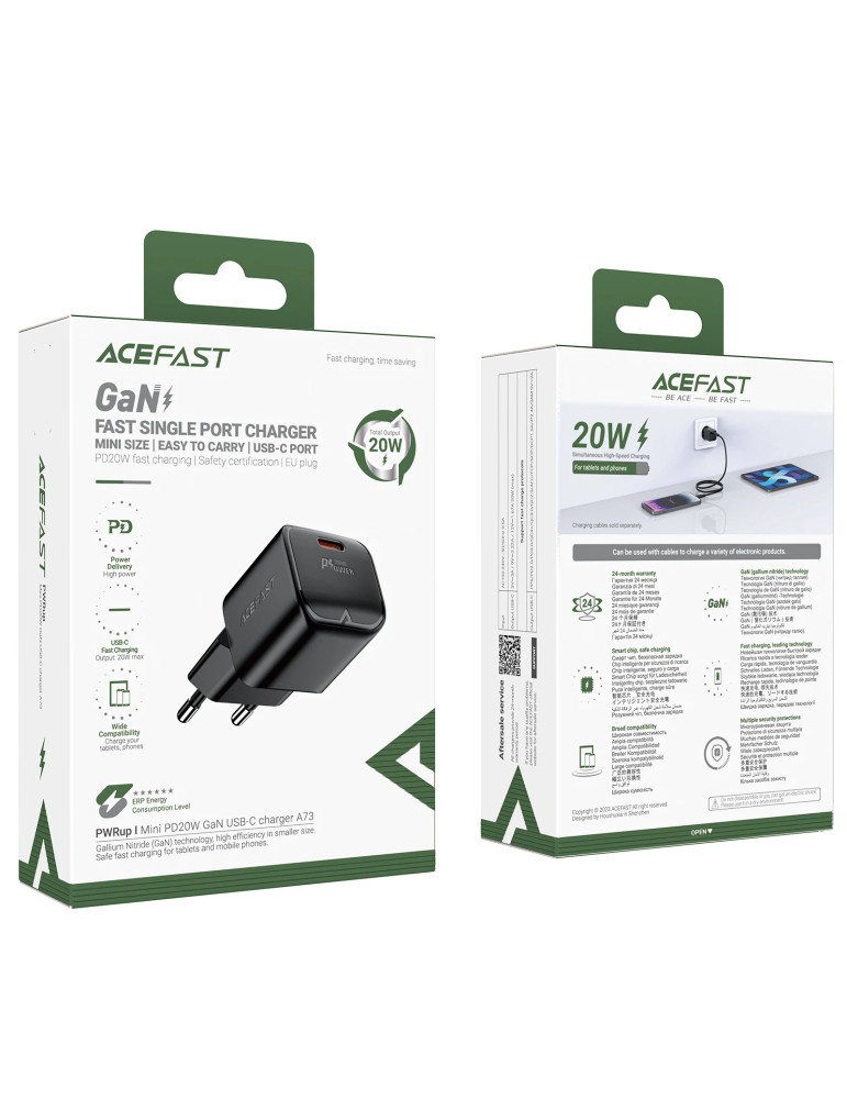 Универсално зарядно за стена Acefast Charger Wall GaN PD20W - A73 Mini - USB-C x 1, Black - ACEFAST-A73-MINI-BK