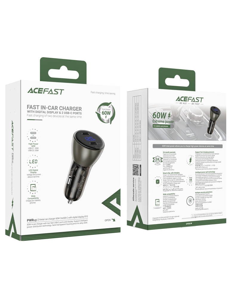 Зарядно за кола Acefast Fast Charger Car PD3.0 60W - B10 - USB-C x 2, Metal, Black - ACEFAST-B10-BK