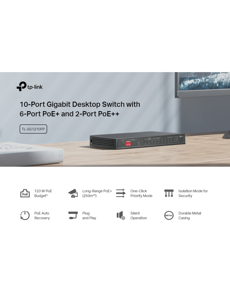 10-портов гигабитен настолен комутатор TP-Link TL-SG1210PP с 6-порта PoE и 2-порта PoE