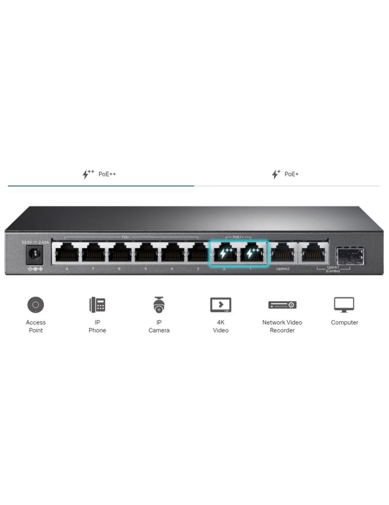 | Интерфейс | 8x PoE+ 10/100/1000Mbps RJ45 Ports |