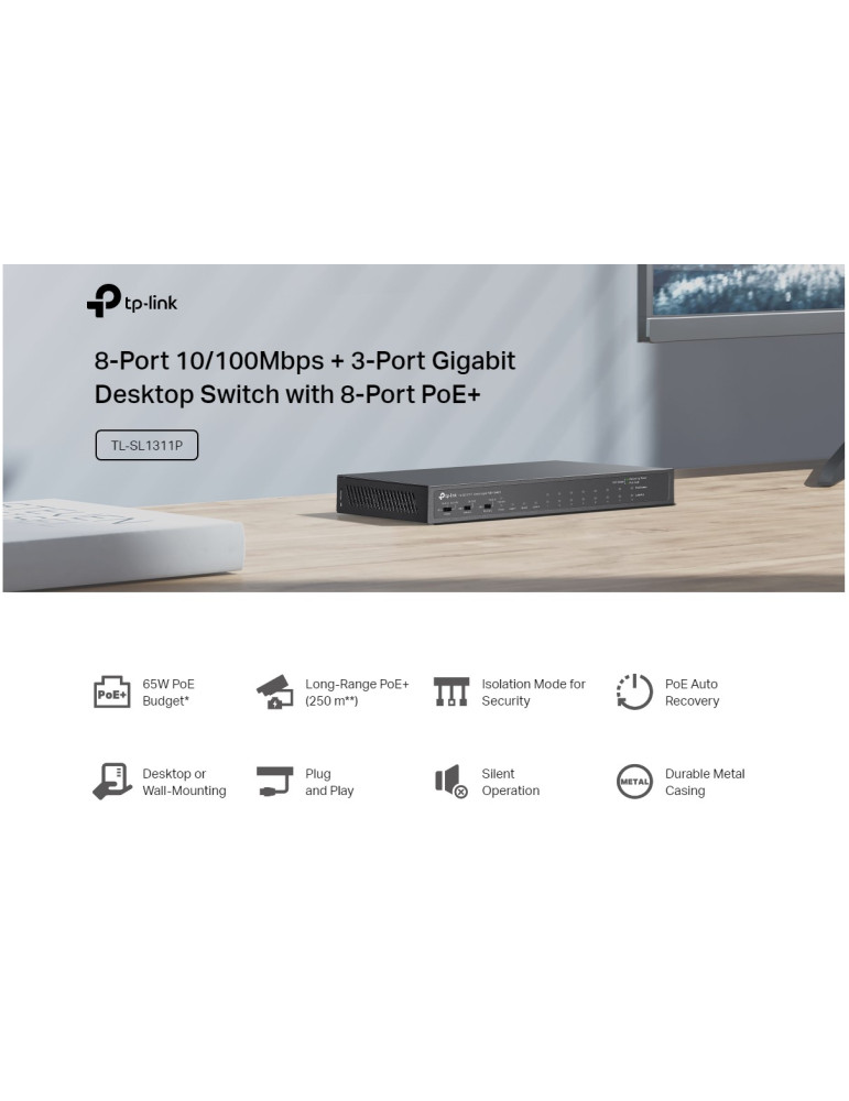 8-портов 10/100Mbps 3-портов гигабитов настолен комутатор с 8-портов PoE TP-Link TL-SL1311P