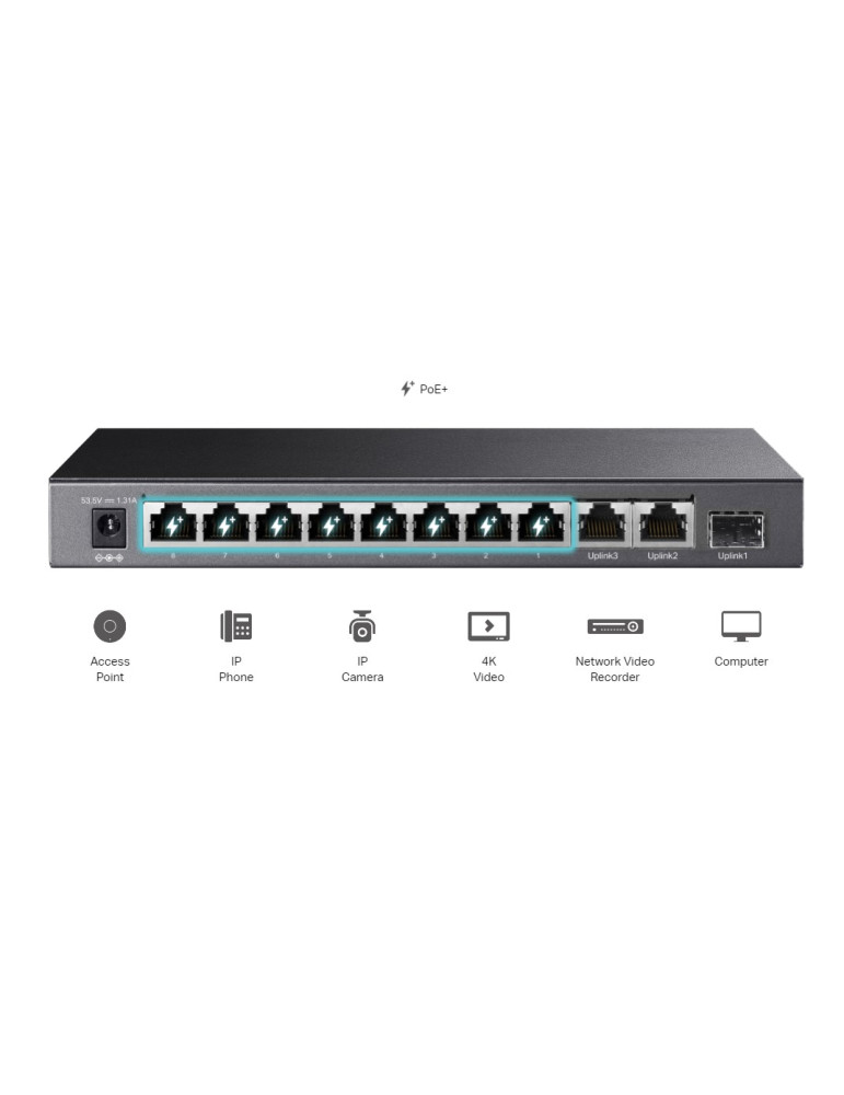 | Интерфейс | 8× 10/100 Mbps 802.3af/at PoE+ Ports, 2× Gigabit RJ45 Ports, 1× Gigabit SFP Port |