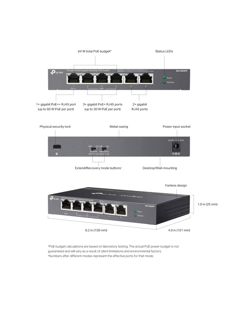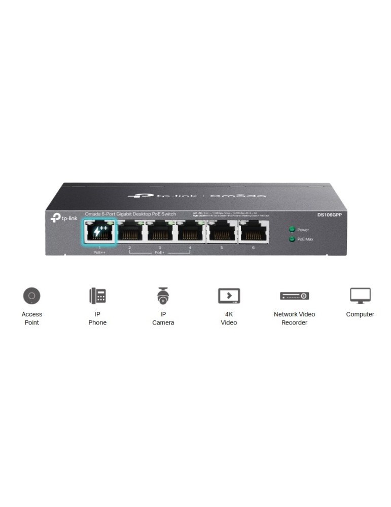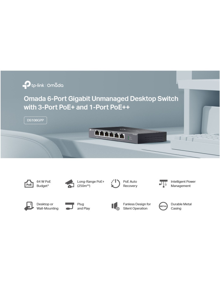 6-портов гигабитов неуправляем комутатор TP-Link Omada DS106GPP с 3-портов PoE и 1-портов PoE