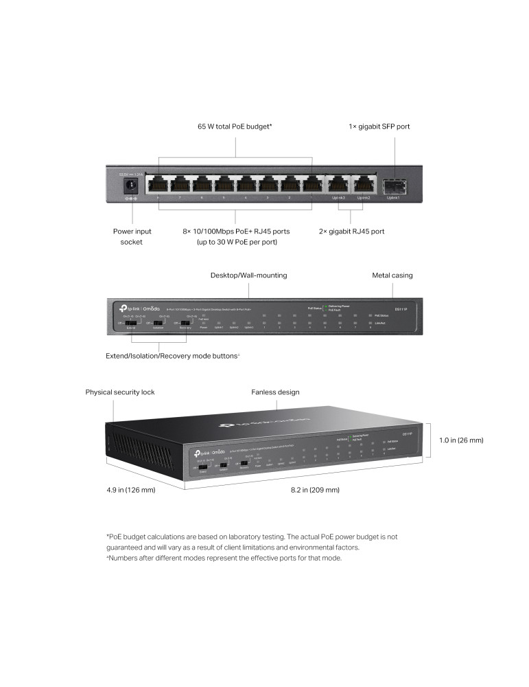| Интерфейс | 8× 10/100 Mbps 802.3af/at PoE+ Ports, 2× Gigabit RJ45 Ports, 1× Gigabit SFP Port |