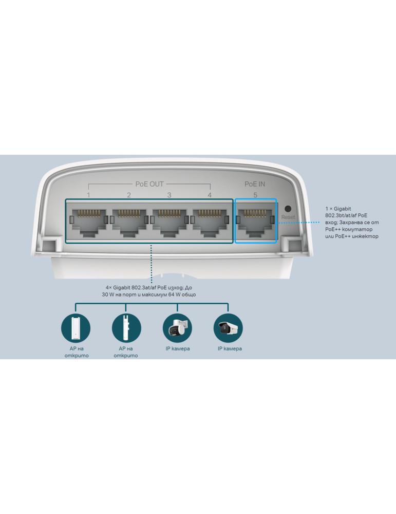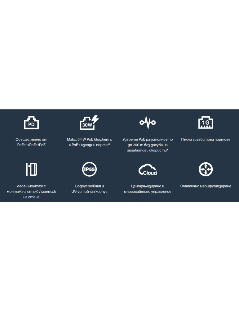 | Мрежови характеристики | DHCP Server Built-in Jumbo Frames Support DoS Attack Protection Radius Authenticated Device Access Web Interface ICMP Support 4 Ports PoE+ 1 Port PoE++ |