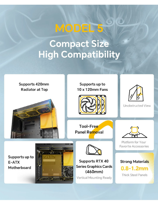 | ДОПЪЛНИТЕЛНИ | 0.8-1.2mm thick steel for entire chassis 5 x 140 mm ARGB fans Pre-Installed (Bottom and Front Side reversed) Dual tempered glass panel Fun yet functional built-in display platform Supports 420mm radiator , E-ATX and 460mm GPUs Supports up to10 x 120mm fans Unique location for the PSU |