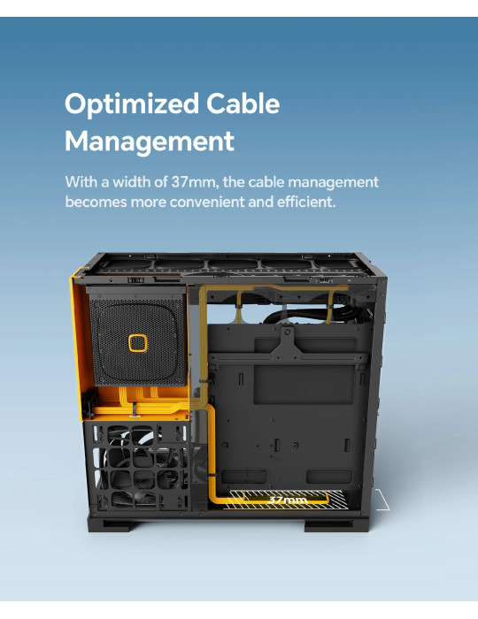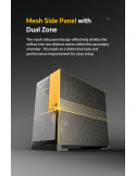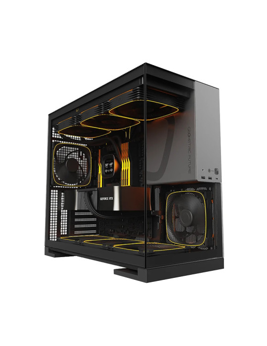 | ДОПЪЛНИТЕЛНИ | 0.8-1.2mm thick steel for entire chassis 5 x 140 mm ARGB fans Pre-Installed (Bottom and Front Side reversed) Dual tempered glass panel Fun yet functional built-in display platform Supports 420mm radiator , E-ATX and 460mm GPUs Supports up to10 x 120mm fans Unique location for the PSU |