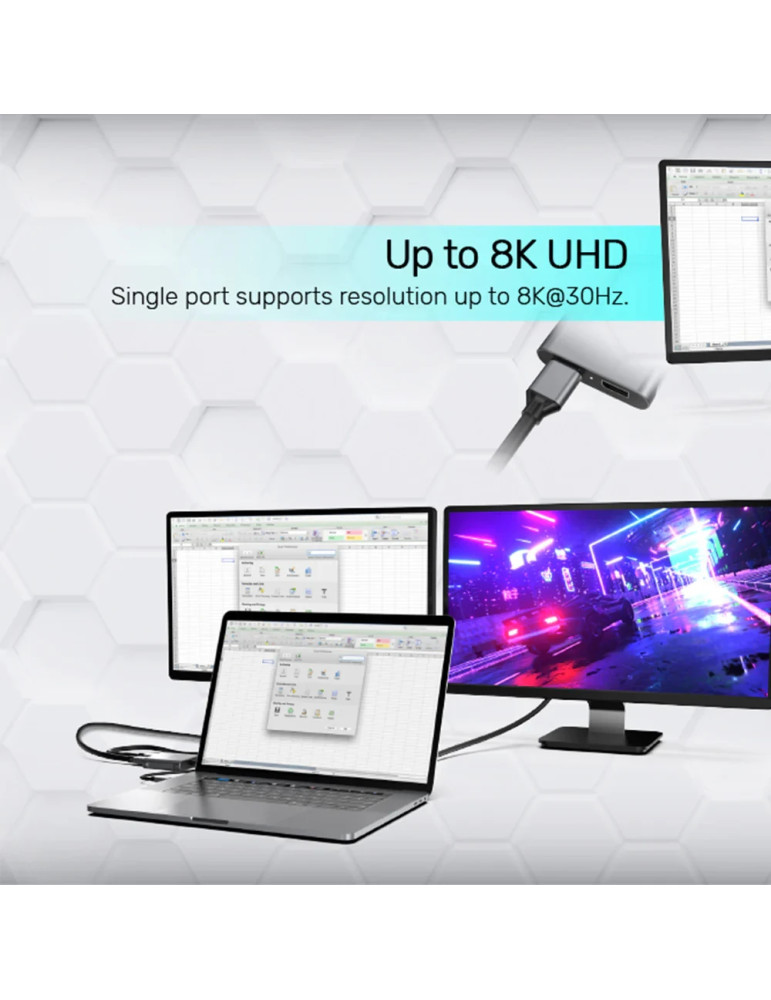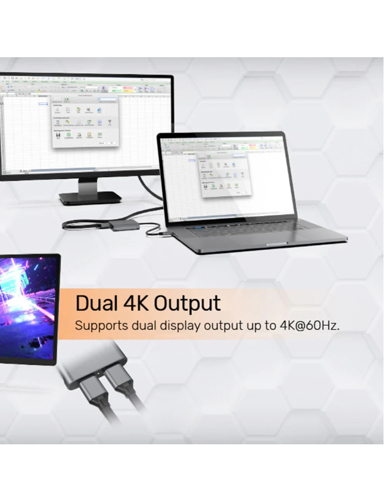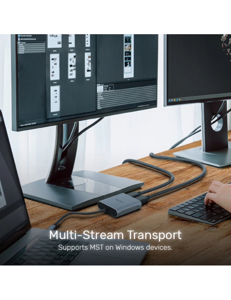 | ДОПЪЛНИТЕЛНИ | Input: USB-C 3.2 (DisplayPort 1.4 Alt Mode) or Thunderbolt 3/4 Material / Color: Aluminium Alloy / Space Grey Output: 2 Port DisplayPort 1.4 Support Windows Display Extended and Mirror mode (MST and SST) Up to 8 channel audio |