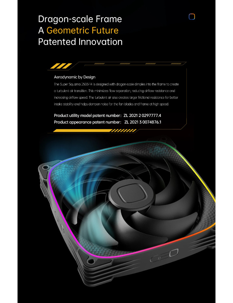 | ДРУГИ | Compatible with Addressable RGB motherboard light sync Covered with aerodynamically streamlined dragon scale particles Elegant and chic fine circle light effect Fine-tuned global dynamic balance for fan Four-corner shockproof rubber pad High-performance quite fan Integrated PWM smart control |