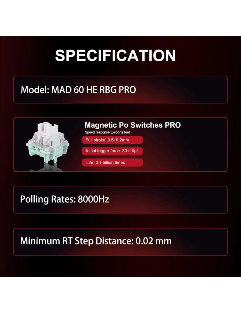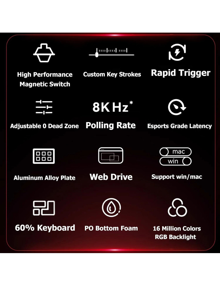 | ДОПЪЛНИТЕЛНИ | 1K Polling Rate 16.8M RGB Adjustable 0 Deadzone Customizable Key Travel Esport Latency Madlions Strap Rapid RT Reset |